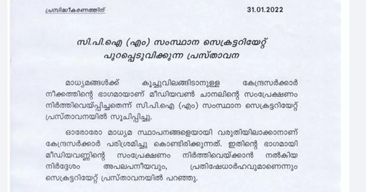 മാധ്യമങ്ങള്ക്ക് കൂച്ചുവിലങ്ങിടാനുള്ള കേന്ദ്രസര്ക്കാര് നീക്കത്തിന്റെ ഭാഗമായാണ് മീഡിയവണ് ചാനലിന്റെ സംപ്രേഷണം നിര്ത്തിവെപ്പിച്ചത്. ഓരോരോ മാധ്യമ സ്ഥാപനങ്ങളെയായി വരുതിയിലാക്കാനാണ് കേന്ദ്രസര്ക്കാര് പരിശ്രമിച്ചുകൊണ്ടിരിക്കുന്നത്. ഇതിന്റെ ഭാഗമായി മീഡിയവണിന്റെ സംപ്രേഷണം നിര്ത്തിവെയ്ക്കാന് നല്കിയ നിര്ദേശം അപലപനീയവും പ്രതിഷേധാര്ഹവുമാണെന്ന് സി.പി.എം സംസ്ഥാന സെക്രട്ടറിയേറ്റ് പ്രസ്താവനയില് പറഞ്ഞു.