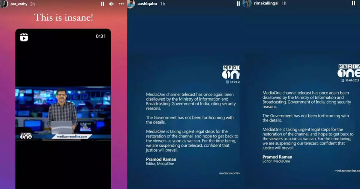മീഡിയവൺ സംപ്രേഷണാവകാശം തടഞ്ഞ കേന്ദ്ര സർക്കാർ നടപടിയിൽ സിനിമാലോകത്തും പ്രതിഷേധം. ചാനലിന് ഐക്യദാർഢ്യവുമായി സിനിമാരംഗത്തെ പ്രമുഖർ രംഗത്തെത്തി. നടിമാരായ പാർവതി തിരുവോത്ത്, റിമ കല്ലിങ്കൽ, സംവിധായകരായ ആഷിഖ് അബു, മുഹ്സിൻ പരാരി, സക്കരിയ തുടങ്ങിയവരെല്ലാം സമൂഹമാധ്യമങ്ങളിലൂടെ ഐക്യദാർഢ്യമറിയിച്ചു. ചാനൽ സംപ്രേഷണം തടഞ്ഞ കേന്ദ്ര നടപടി വിവരം അറിയിച്ചുകൊണ്ടുള്ള എഡിറ്റർ പ്രമോദ് രാമന്റെ കുറിപ്പും വാർത്തയും ഇൻസ്റ്റഗ്രാം സ്റ്റോറിയിൽ പങ്കിട്ടായിരുന്നു പ്രമുഖർ പിന്തുണ അറിയിച്ചത്. ഇത് ഭ്രാന്തമായ നടപടിയാണെന്നാണ് പാർവതി പ്രതികരിച്ചത്.