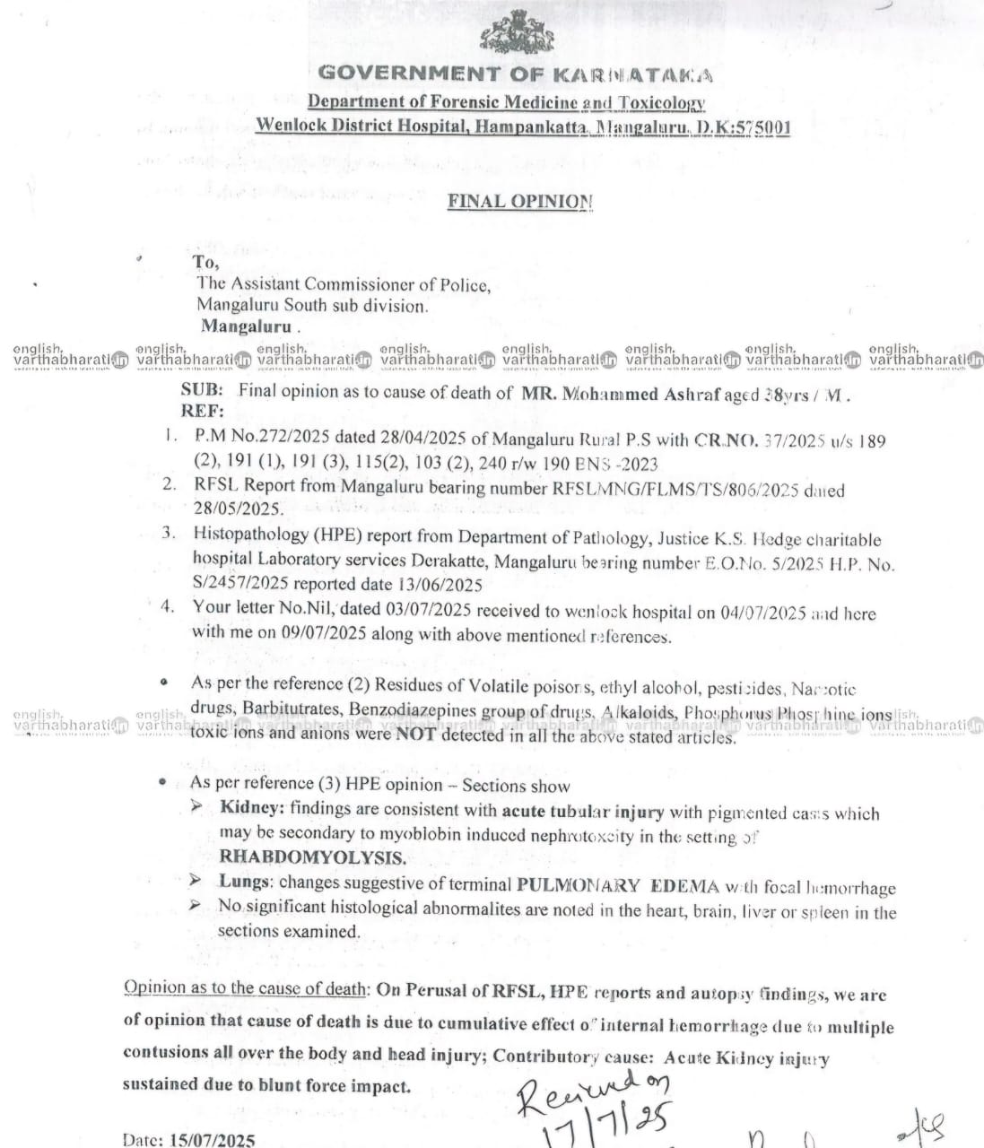 കഴിഞ്ഞ ഏപ്രിൽ 27 ന് കുടുപ്പു ഭൈരകുത്താർത്തി ക്ഷേത്രത്തിന് പിന്നിൽ നിന്ന് കണ്ടെത്തിയ മൃതദേഹത്തിന്റെ അന്തിമ പോസ്റ്റ്മോർട്ടം, ഫോറൻസിക് റിപ്പോർട്ടുകളിലാണ് അക്രമാസക്തവും ക്രൂരവുമായ ആക്രമണത്തിന്റെ ഞെട്ടിക്കുന്ന വിവരങ്ങൾ വെളിപ്പെടുത്തിയത്. സമഗ്രമായ ഫോറൻസിക് പരിശോധനക്കും ഹിസ്റ്റോപത്തോളജിക്കൽ വിശകലനത്തിനും ശേഷം സമാഹരിച്ച റിപ്പോർട്ടുകൾ ശരീരത്തിലും തലയിലുമുള്ള ഒന്നിലധികം പരിക്കുകൾ മൂലമാണ് അഷ്റഫ് മരിച്ചതെന്ന് സ്ഥിരീകരിക്കുന്നു, ഗുരുതരമായ വൃക്ക തകരാറും ഇതിന് കാരണമായി. ഏപ്രിൽ 28ന് മംഗളൂരു ഗവ.വെൻലോക്ക് ആശുപത്രിയിൽ രാത്രി 10നും 11.30 നും ഇടയിൽ ദേർളക്കട്ടെയിലെ ക്ഷിമയിൽ നിന്നുള്ള ഡോ. മഹാബലേഷ് ഷെട്ടി ഉൾപ്പെടെയുള്ള ഫോറൻസിക് വിദഗ്ധരുടെ സാന്നിധ്യത്തിൽ അഷ്റഫിന്റെ പോസ്റ്റ്മോർട്ടം നടത്തി.