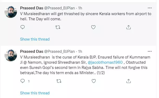 |മുരളീധരൻ കേരള ബി.ജെ.പിയുടെ ശാപമാണ്. കുമ്മനം മുതൽ ജേക്കബ് തോമസ് വരെയുള്ളവരുടെ തോൽവിക്ക് കാരണം മുരളീധരനാണെന്നും പ്രസീദ് ദാസിന്റെ ട്വീറ്റ്