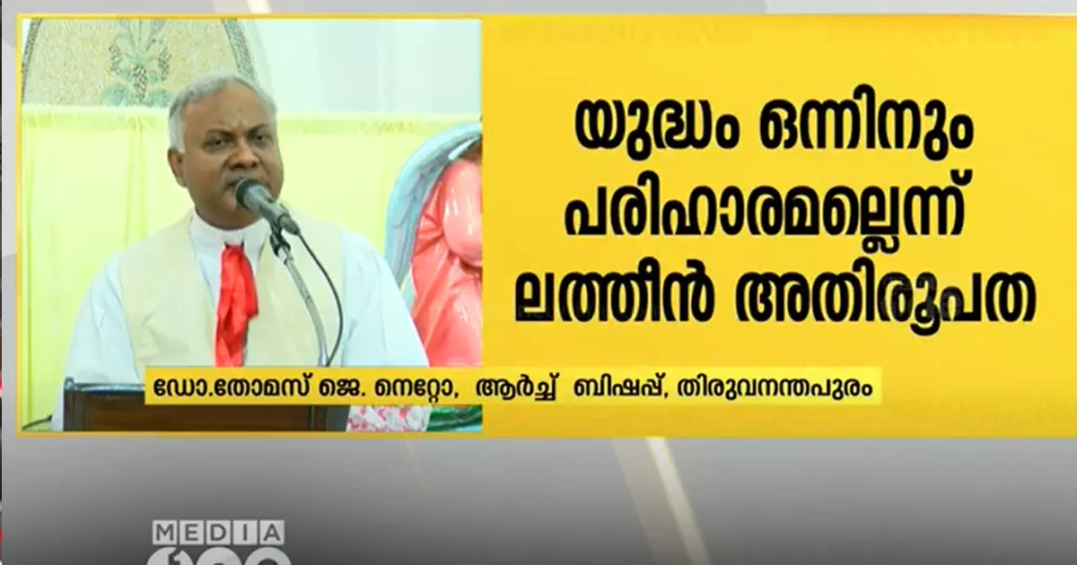 തിരുവനന്തപുരം: യുദ്ധ നിവാരണത്തിനും ലോക സമാധാനത്തിനു വേണ്ടി ലത്തീൻ പള്ളികളിൽ പ്രാർത്ഥന നടക്കുന്നു. യുദ്ധത്തിൽ കെടുതി അനുഭവിക്കുന്നവർക്ക് വേണ്ടിയാണ് ഈ പ്രാർഥനയെന്നും യുദ്ധം ഒന്നിനും പരിഹാരമല്ലെന്നും പരാജയമാണെന്നും തിരുവനന്തപുരം അതിരൂപത ആർച്ച് ബിഷപ് ഡോ. തോമസ് ജെ. നെറ്റോ പറഞ്ഞു.