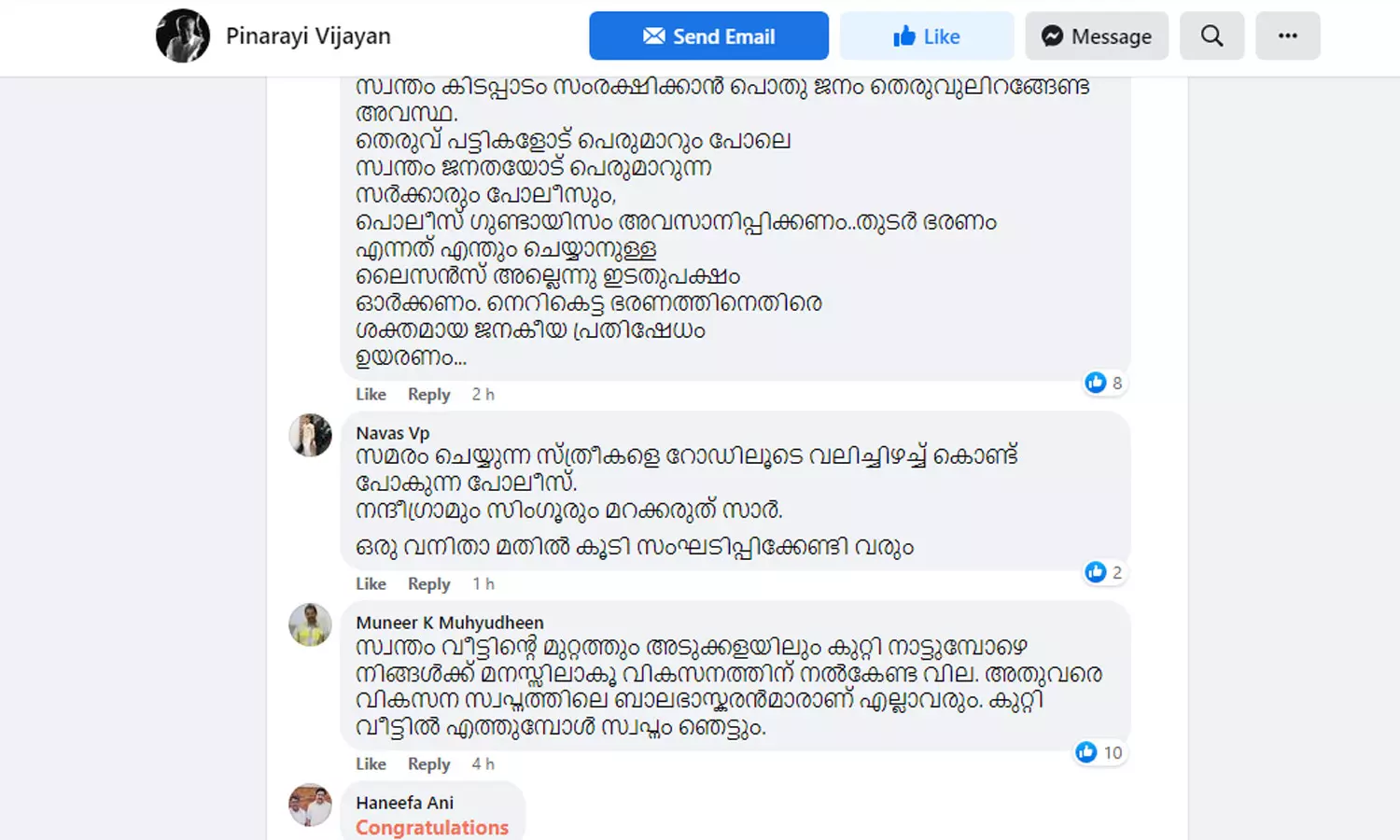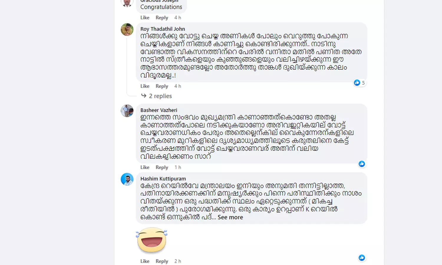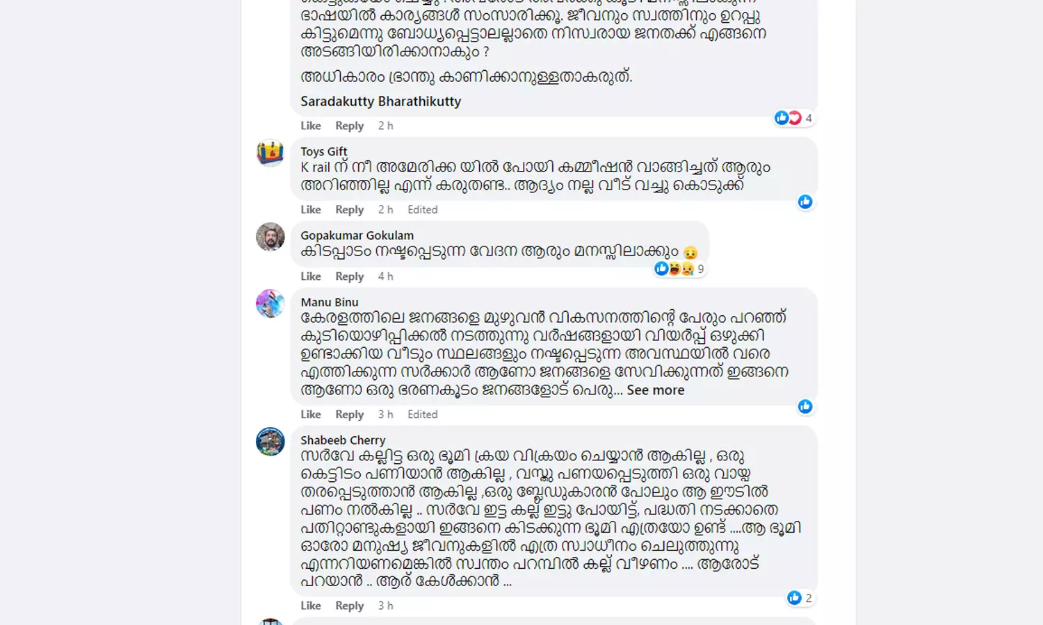 ' അധികാരത്തിന്റെ അഹന്ത മുഖ്യമന്ത്രി കാണിക്കരുത്. അങ്ങ് ദാഷ്ട്യം അവസാനിപ്പിക്കണം. കെ റെയിൽ പദ്ധതിയുടെ പേരിൽ പോലീസിനെ ഉപയോഗിച്ച് കേരളത്തിലെ സാധാരണ ജനങ്ങളെ അടിച്ചമർത്തരുത്. സമരം ചെയ്യുന്നത് മുഴുവൻ കോൺഗ്രസുകാരും ബിജെപിക്കാരും അല്ല എന്ന തിരിച്ചറിവ് അങ്ങേക്ക് ഉണ്ടാകണം.' - ചിലർ എഴുതി