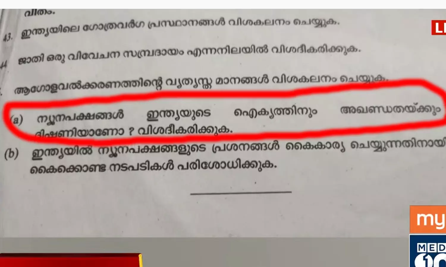 ന്യൂനപക്ഷങ്ങള് ഇന്ത്യയുടെ അഖണ്ഡതക്ക് ഭീഷണിയാണോ? വിവാദ ചോദ്യവുമായി ഹയര് സെക്കണ്ടറി ചോദ്യപേപ്പര്