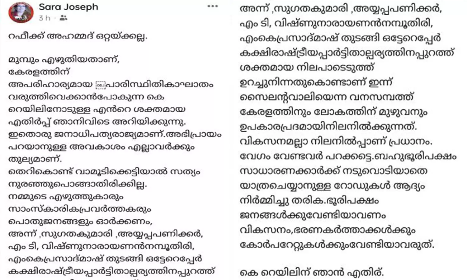 |വികസനമല്ല നിലനിൽപ്പാണ് പ്രധാനം. വേഗം വേണ്ടവർ പറക്കട്ടെ. ബഹുഭൂരിപക്ഷം സാധാരണക്കാർക്ക് നടുവൊടിയാതെ യാത്രചെയ്യാനുള്ള റോഡുകൾ ആദ്യം നിർമിച്ചുതരിക. ഭൂരിപക്ഷം ജനങ്ങൾക്കുവേണ്ടിയാവണം വികസനം; ഭരണകർത്താക്കൾക്കും കോർപറേറ്റുകൾക്കും വേണ്ടിയാവരുത്..'' ഫേസ്ബുക്ക് കുറിപ്പിൽ സാറാ ജോസഫ്
