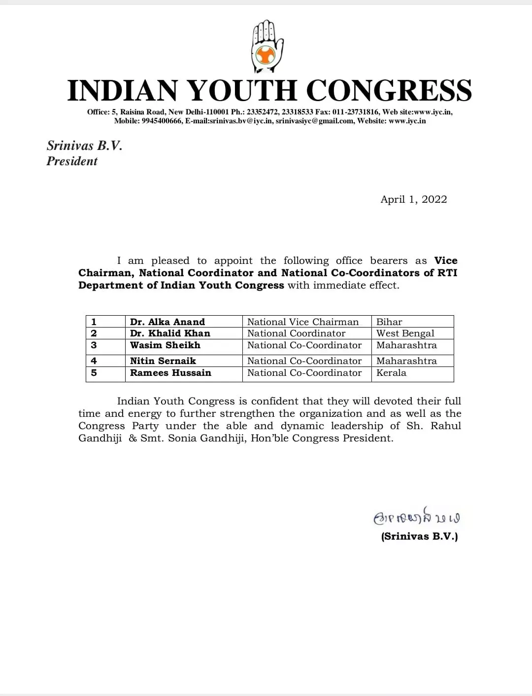 യൂത്ത് കോൺഗ്രസ് ദേശീയ വിവരാവകാശ വിഭാഗം കോ-ഓഡിനേറ്ററായി മലയാളിയായ റമീസ് ഹുസൈൻ