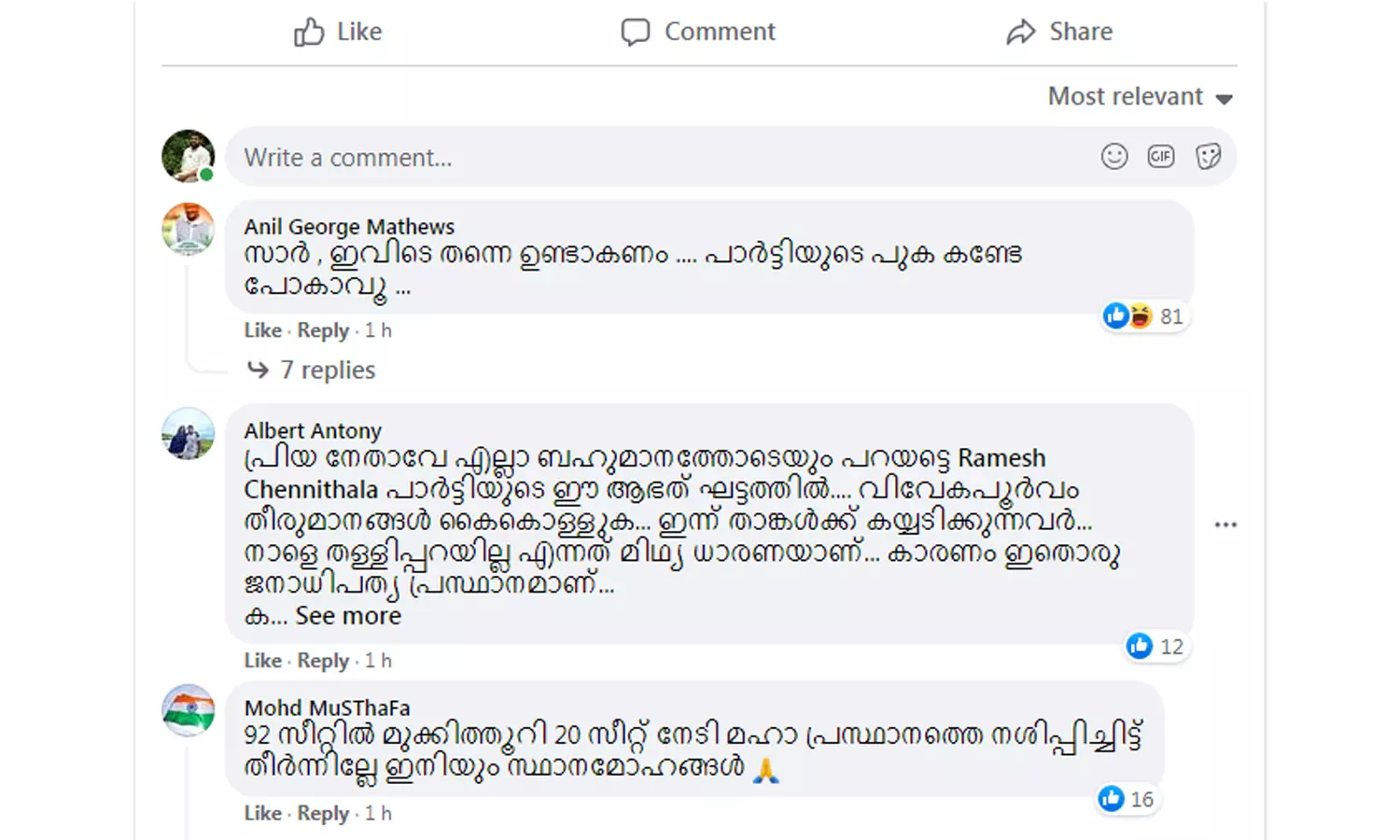അതേസമയം സോഷ്യല് മീഡിയയില് കെ.സുധാകരനും വി.ഡി സതീശനും വലിയ പിന്തുണയാണ് സാധാരണ പാര്ട്ടി പ്രവര്ത്തകരില് നിന്ന് ലഭിക്കുന്നത്. ചെന്നിത്തലയുടെ പോസ്റ്റിനടിയിലും കടുത്ത വിമര്ശനങ്ങളാണ് പ്രവര്ത്തകര് ഉന്നയിക്കുന്നത്. സാര് ഇവിടെ തന്നെ ഉണ്ടാകണം..പാര്ട്ടിയുടെ പുക കണ്ടേ പോകാവൂ എന്നാണ് ഒരാളുടെ കമന്റ്.