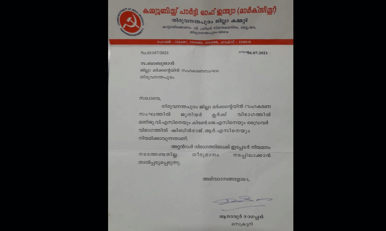 തിരുവനന്തപുരം ജില്ലാ മർക്കന്റെയിൻ സഹകരണ സംഘത്തിൽ ജൂനിയർ ക്ലർക്ക് വിഭാഗത്തിൽ മഞ്ജു.വി.എസിനെയും കിരൺ ജെ.എസിനെയും ഡ്രൈവർ വിഭാഗത്തിൽ ഷിബിൻരാജ് ആർ.എസിനെയും നിയമിക്കാവുന്നതാണ്.. അറ്റന്റർ വിഭാഗത്തിലേക്ക് ഇപ്പോൾ നിയമനം നടത്തേണ്ടതില്ല.. തീരുമാനം നടപ്പിലാക്കാൻ താത്പര്യപ്പെടുന്നു