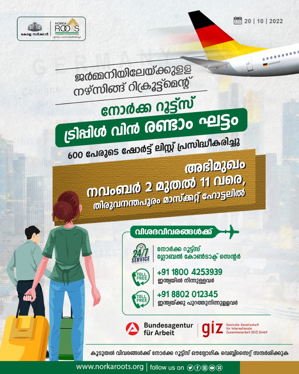ജർമനിയിലെ ഫെഡറൽ എംപ്ലോയ്മെൻറ് ഏജൻസിയും ജർമ്മൻ ഏജന്സി ഫോർ ഇന്റർനാഷണൽ കോ-ഓപ്പറേഷനും നോർക്ക റൂട്ട്സും സംയുക്തമായി നടത്തുന്ന നഴ്സിങ്ങ് റിക്രൂട്ട്മെന്റ് പദ്ധതിയായ ട്രിപ്പിൾ വിൻ പ്രോഗ്രാമിൻറെ രണ്ടാം ഘട്ടത്തിലേയ്ക്ക് അപേക്ഷിച്ച 600 പേരുടെ ഷോർട്ട്ലിസ്റ്റ് പ്രസിദ്ധീകരിച്ചു. ഇവർക്കായുള്ള അഭിമുഖം നവംബർ 2 മുതൽ 11 വരെ തിരുവനന്തപുരം മാസ്ക്കറ്റ് ഹോട്ടലിൽ നടക്കും. ഷോർട്ട് ലിസ്റ്റ് ചെയ്യപ്പെട്ടവർക്ക് അവരവരുടെ ഇന്റര്വ്യൂ സ്ലോട്ടുകൾ ഇമെയില് മുഖേന അറിയിച്ചിട്ടുണ്ട്. ലഭിക്കാത്തവർ നോര്ക്ക-റൂട്ട്സിന്റെ ടോൾ ഫ്രീ നമ്പറായ 1800-425-3939 എന്ന നമ്പറിൽ ബന്ധപ്പെടണമെന്ന് നോർക്ക സി.ഇ.ഒ. അറിയിച്ചു.