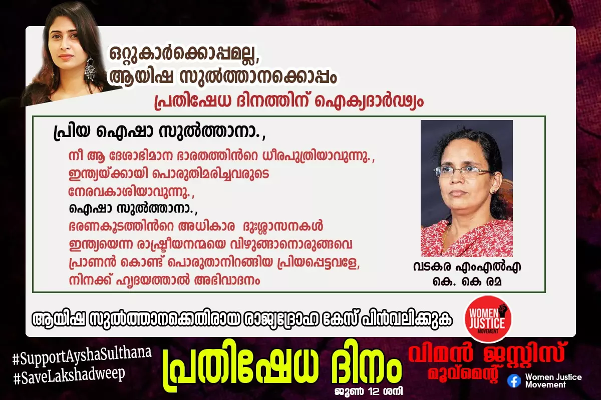 കോവിഡ് പ്രോട്ടോകോളുകൾ തകിടം മറിച്ച അഡ്മിനിസ്ട്രേറ്ററുടെ നടപടി ഒരു ജൈവായുധ ആക്രമണത്തിന് സമാനമാണെന്ന് പറഞ്ഞതിന്റെ പേരിൽ ഐഷ സുൽത്താനയെ വേട്ടയാടാനുള്ള സംഘ് പരിവാർ ശ്രമത്തിനെതിരെ വ്യാപക പ്രതിഷേധമുയർത്തുവാൻ ആഹ്വാനം ചെയ്തും ആയിഷ സുൽത്താനക്ക് എെക്യദാർഢ്യം അറിയിച്ചുകൊണ്ടുമാണ് ജൂൺ12 ശനി പ്രതിഷേധ ദിനമായി ആചരിച്ചത്. സത്യം വിളിച്ചു പറയുന്നവരെ രാജ്യദ്രോഹ കേസിൽ കുടുക്കുവാനുള്ള ഗൂഢാലോചനക്കെതിരെ ജനാധിപത്യപരവും ജനകീയവുമായ പ്രക്ഷോഭങ്ങൾ ശക്തിപ്പെടണമെന്ന് പ്രതിഷേധ ദിനം ഉൽഘാടനം ചെയ്ത് ജബീന ഇർഷാദ് പറഞ്ഞു.