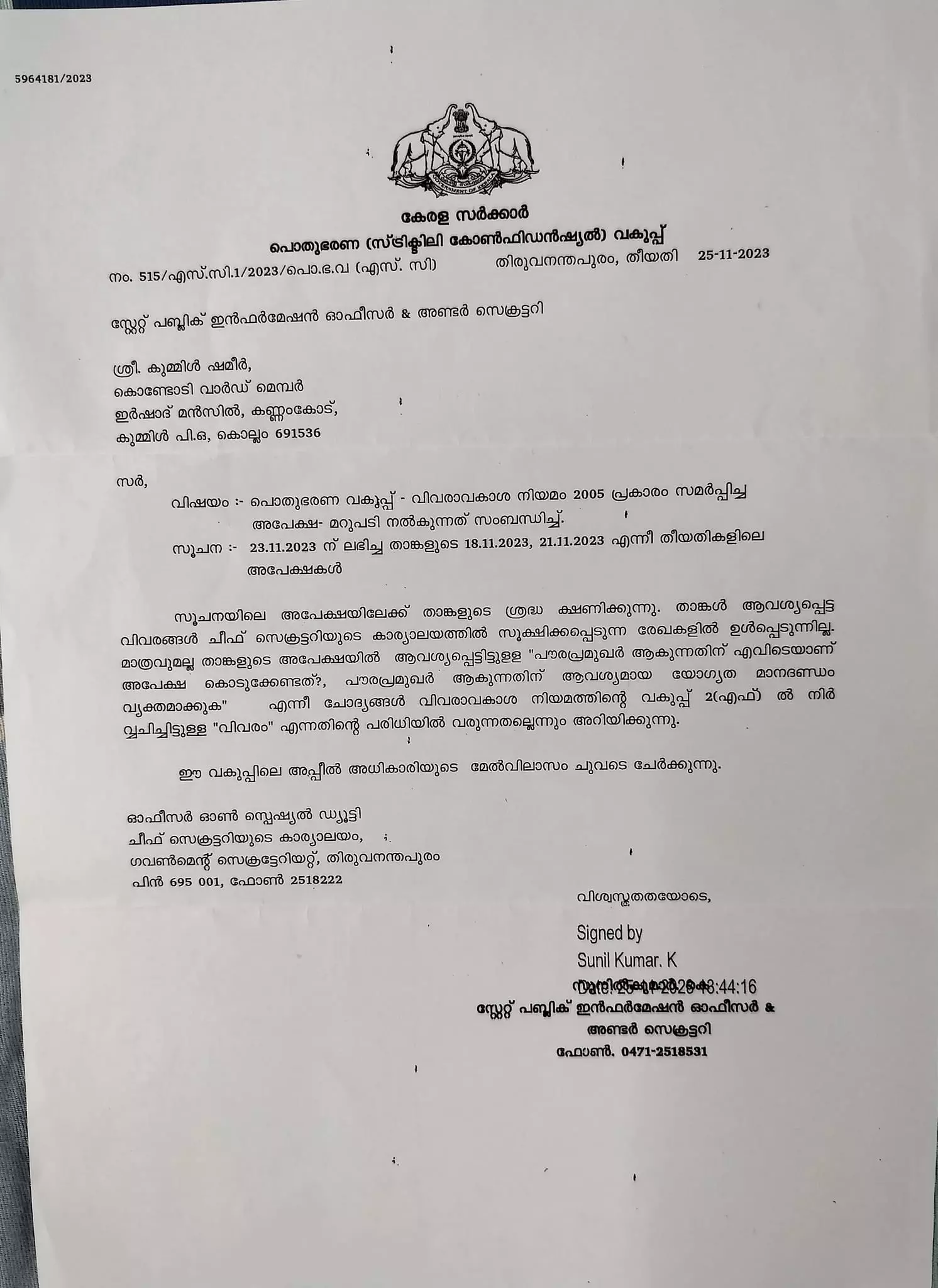 സൂചനയിലെ അപേക്ഷയിലേക്ക് താങ്കളുടെ ശ്രദ്ധ ക്ഷണിക്കുന്നു. താങ്കൾ ആവശ്യപ്പെട്ട വിവരങ്ങൾ ചീഫ് സെക്രട്ടറിയുടെ കാര്യാലയത്തിൽ സൂക്ഷിക്കപ്പെടുന്ന രേഖകളിൽ ഉൾപ്പെടുന്നില്ല. മാത്രവുമല്ല താങ്കളുടെ അപേക്ഷയിൽ ആവശ്യപ്പെട്ടിട്ടുള്ള 'പൗരപ്രമുഖൻ ആവുന്നതിന് എവിടെയാണ് അപേക്ഷ നൽകേണ്ടത്?', 'പൗരപ്രമുഖർ ആവുന്നതിന് ആവശ്യമായ യോഗ്യതാ മാനദണ്ഡം വ്യക്തമാക്കുക' എന്നീ ചോദ്യങ്ങൾ വിവരാവകാശ നിയമത്തിന്റെ വകുപ്പ് 2 (എഫ്)ൽ നിർവചിച്ചിട്ടുള്ള വിവരം എന്ന പരിധിയിൽ വരുന്നതല്ലെന്നും അറിയിക്കുന്നു.