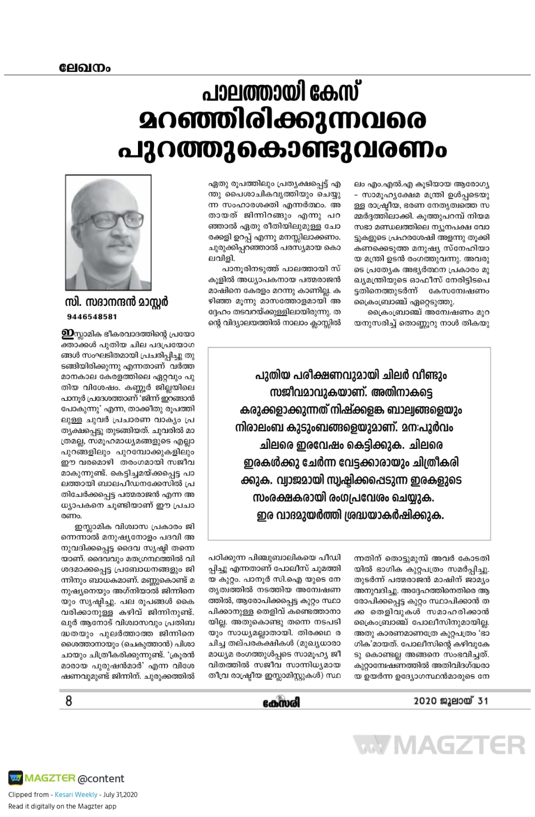 പലതിന്റെ പരീക്ഷണശാലയാണ് കേരളം. മതമൗലിക തീവ്രവാദ സംഘടനകള് പല ബ്രാന്ഡുകളില് പല തലങ്ങളില് സജീവമാണിവിടെ. ലവ് ജിഹാദ് പോലുള്ള പ്രതിഭാസങ്ങള് ഹരിശ്രീ കുറിച്ചത് കേരളത്തിലാണെന്നും സദാനന്ദന് ആരോപിക്കുന്നു. ആര്എസ്എസ് കാര്യകര്ത്താക്കളായ അനേകം അധ്യാപകര് പൊതുജനാംഗീകാരം നേടിയവരുണ്ട്. അവരെ വീഴ്ത്താനുള്ള ഉപകരണമായി പോക്സോ നിയമം ഉപയോഗിക്കുകയാണെന്ന ആരോപണവും സദാനന്ദന് ലേഖനത്തില് ഉയര്ത്തുന്നുണ്ട്.