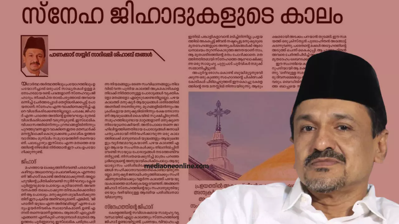 നിക്ഷിപ്ത താത്പര്യക്കാരുടെ തെറ്റായ പ്രയോഗം മൂലം ഏറെ തെറ്റിദ്ധരിപ്പിക്കപ്പെട്ട വാക്കാണ് 'ജിഹാദെ'ന്ന് സാദിഖലി ശിഹാബ് തങ്ങള്. തെറ്റായി വ്യാഖാനിക്കപ്പെടുന്ന ജിഹാദിന്റെ ശരിയായ അര്ഥം മനസ്സിലാക്കി കൊടുക്കേണ്ട ഉത്തരവാദിത്തം മുസ്ലിങ്ങള്ക്കുണ്ടെന്നും സാദിഖലി തങ്ങള് ഫേസ്ബുക്കില് കുറിച്ചു. കേരള പൊതുമണ്ഡലത്തില് വീണ്ടും ജിഹാദ് ചര്ച്ച ചൂടിപിടിച്ചിരിക്കെയാണ് 'സ്നേഹ ജിഹാദി'നെ കുറിച്ചുള്ള സാദിഖലി തങ്ങളുടെ ലേഖനം.