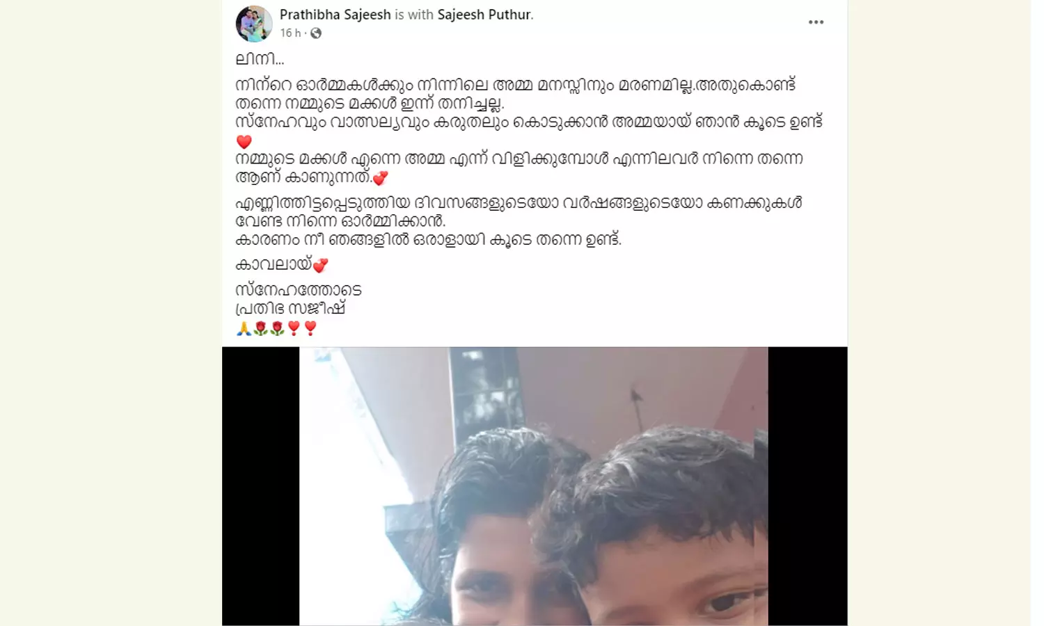 'ഇന്ന് ഞങ്ങൾ തനിച്ചല്ല, ഒരു അമ്മയുടെ സ്നേഹവും വാത്സ്യല്യവും നമ്മുടെ മക്കൾക്കും കിട്ടുന്നുണ്ട്'; ഹൃദയ സ്പർശിയായ കുറിപ്പുമായി ലിനിയുടെ ഭർത്താവ്