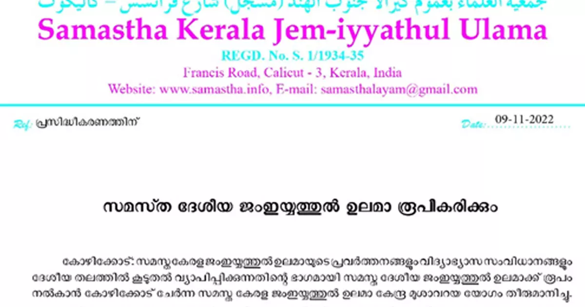|കോഴിക്കോട്ട് ചേർന്ന സമസ്ത കേരള ജംഇയ്യത്തുൽ ഉലമാ കേന്ദ്ര മുശാവറ യോഗത്തിലാണ് തീരുമാനം
