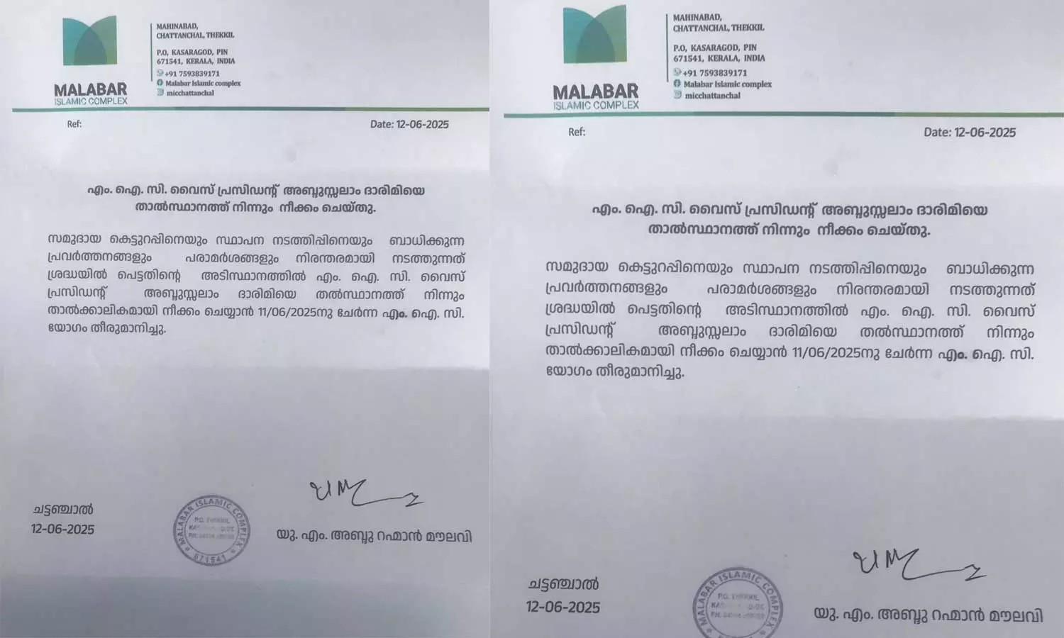 സമസ്ത മുഷാവറ അംഗം അബ്ദുസ്സലാം ദാരിമിയെ കാസർകോട് എംഐസി വൈസ് പ്രസിഡൻ്റ് സ്ഥാനത്ത് നിന്ന് നീക്കി