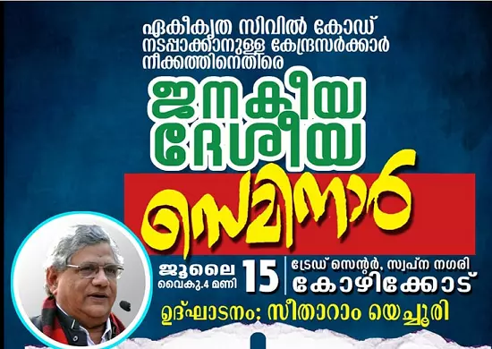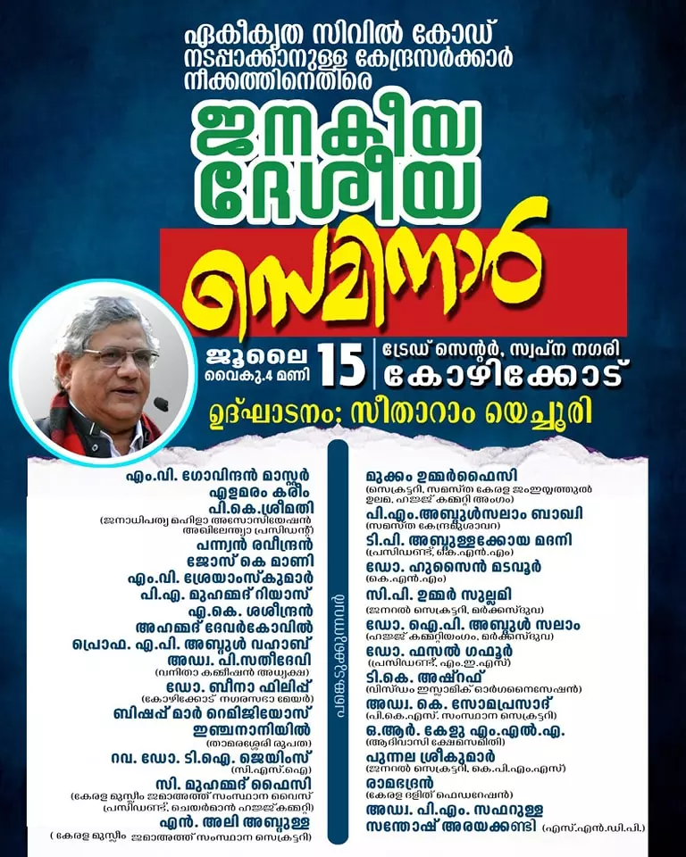 ഏക സിവില് കോഡ് നടപ്പാക്കാനുള്ള കേന്ദ്ര സർക്കാർ നീക്കത്തിനെതിരെ ദേശീയ തലത്തില് തന്നെ നടക്കുന്ന ആദ്യ ജനകീയ പരിപാടിയാണ് ഇന്ന് കോഴിക്കോട് സ്വപ്ന നഗരിയില് സി.പി.എം സംഘടിപ്പിക്കുന്ന ജനകീയ ദേശീയ സെമിനാർ. സി. പി.എം ജനറല് സെക്രട്ടറി സീതാറാം യെച്ചൂരി ഉദ്ഘാടനം ചെയ്യുന്ന സെമിനാറില് എല്.ഡി.എഫിലെ വിവിധ പാർട്ടികളെ പ്രതിനിധീകരിച്ച് എം.വി ഗോവിന്ദന് മാസ്റ്റർ, എളമരം കരീം ഇ. കെ വിജയന്, ജോസ് കെ, മാണി, ശ്രേയാംസ് കുമാർ തുടങ്ങിയവർ പങ്കെടുക്കും.