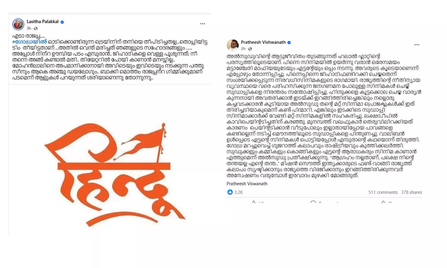 പൃഥ്വിരാജിനെ അൽസുഡു എന്നുവിളിച്ചാണ് പ്രതീഷ് വിശ്വനാഥിന്റെ പോസ്റ്റ്. 'അൽസുഡുവിൻ്റെ ആടുജീവിതം തുടങ്ങുന്നത് ഹലാൽ ഫ്ലാറ്റിൻ്റെ പരസ്യത്തിലൂടെയാണ്. പിന്നെ സിനിമയിൽ ഉയർന്നു വരാൻ ഒരേസമയം മട്ടാഞ്ചേരി മാഫിയയുടേയും ഏട്ടൻ്റേയും ഒപ്പം നടന്നു. പിന്നെപ്പിന്നെ ജിഹാദി ഫണ്ടിറക്കി ചെയ്തതെന്ന് സംശയിക്കപ്പെടുന്ന നിരവധി സിനിമകളുടെ ഭാഗമായി. രാജ്യത്തിൻ്റെ നീതിന്യായ വ്യവസ്ഥയെ വരെ പരിഹസിക്കുന്ന ജനഗണമന പോലുള്ള സിനിമകൾ ചെയ്ത് സുഡാപ്പികളെ നിരന്തരം സന്തോഷിപ്പിച്ചു. ഗോധ്ര മറച്ചുവെച്ച് ഗുജറാത്ത് കലാപവും രാഷ്ട്രീയവും കുത്തിക്കലർത്തി. സുഡുക്കളും കമ്മികളും കൊങ്ങികളും ഏട്ടൻ്റെ ആരാധകരും സിനിമ കാണാൻ എത്തുമെന്ന് അൽസുഡു പ്രതീക്ഷിക്കുന്നു. "ആഗ്രഹം നല്ലതാണ്, പക്ഷെ നിൻ്റെ തന്തയല്ല എൻ്റെ തന്ത". മിഷൻ സൗത്ത് ഇന്ത്യക്കാരുടെ ഫണ്ട് വാങ്ങി രാജ്യത്ത് കലാപം സൃഷ്ടിക്കാനും രാജ്യത്തെ വിഭജിക്കാനും ഇറങ്ങിത്തിരിക്കുന്നവർ അന്വേഷണം വരുമ്പോൾ ഇരവാദം മുഴക്കി മോങ്ങരുത്'- എന്നാണ് പ്രതീഷ് വിശ്വനാഥിന്റെ ഭീഷണി. അതേസമയം, പൃഥ്വിരാജിന് കൈയടിയും പിന്തുണയുമായി നിരവധി ആരാധകർ രംഗത്തെത്തിയിട്ടുണ്ട്.