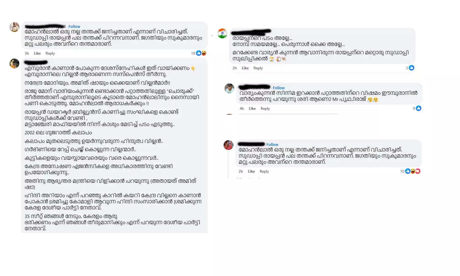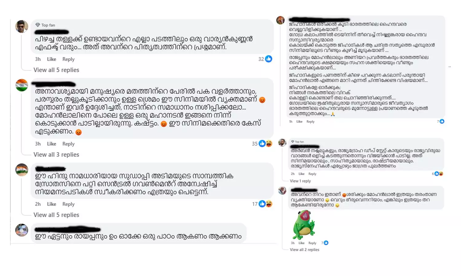 മോഹൻലാലിന്റെയും പൃഥ്വിരാജിന്റേയും തിരക്കഥാകൃത്ത് മുരളീഗോപിയുടേയും പോസ്റ്റുകൾക്കും താഴെയും അധിക്ഷേപ- ഭീഷണി പരാമർശങ്ങളുണ്ട്. ചിത്രം തിയേറ്ററുകളില് എത്തിയതിന് പിന്നാലെ ‘താങ്ക്യൂ ഓള്’ എന്ന പൃഥ്വിരാജിന്റെയും മോഹൻലാലിന്റേയും ഫേസ്ബുക്ക് പോസ്റ്റിന് താഴെയാണ് സൈബര് ആക്രമണം. 'രാജപ്പനും മോഹൻലാലും അണിയറ പ്രവർത്തകരും ഭാരതത്തിലെ ഹൈന്ദവരുടെ ക്ഷമയെയും സഹനശക്തിയെയും വീണ്ടും പരീക്ഷിക്കുകയാണ് എന്നാണ് ഒരാളുടെ കമന്റ്. ജിഹാദികളുടെ പണത്തിന് കീഴെ പറക്കുന്ന കടലാസ് പരുന്തായി മോഹൻലാൽ എങ്ങനെ മാറി എന്നത് ചിന്തിക്കേണ്ട വിഷയമാണ്, ജിഹാദികളേ ഓർക്കുക; നിങ്ങൾ നരകത്തിലെ വിറക് കൊള്ളി കൊണ്ടാണ് തല ചൊറിഞ്ഞിരിക്കുന്നത്'- കമന്റിൽ പറയുന്നു.