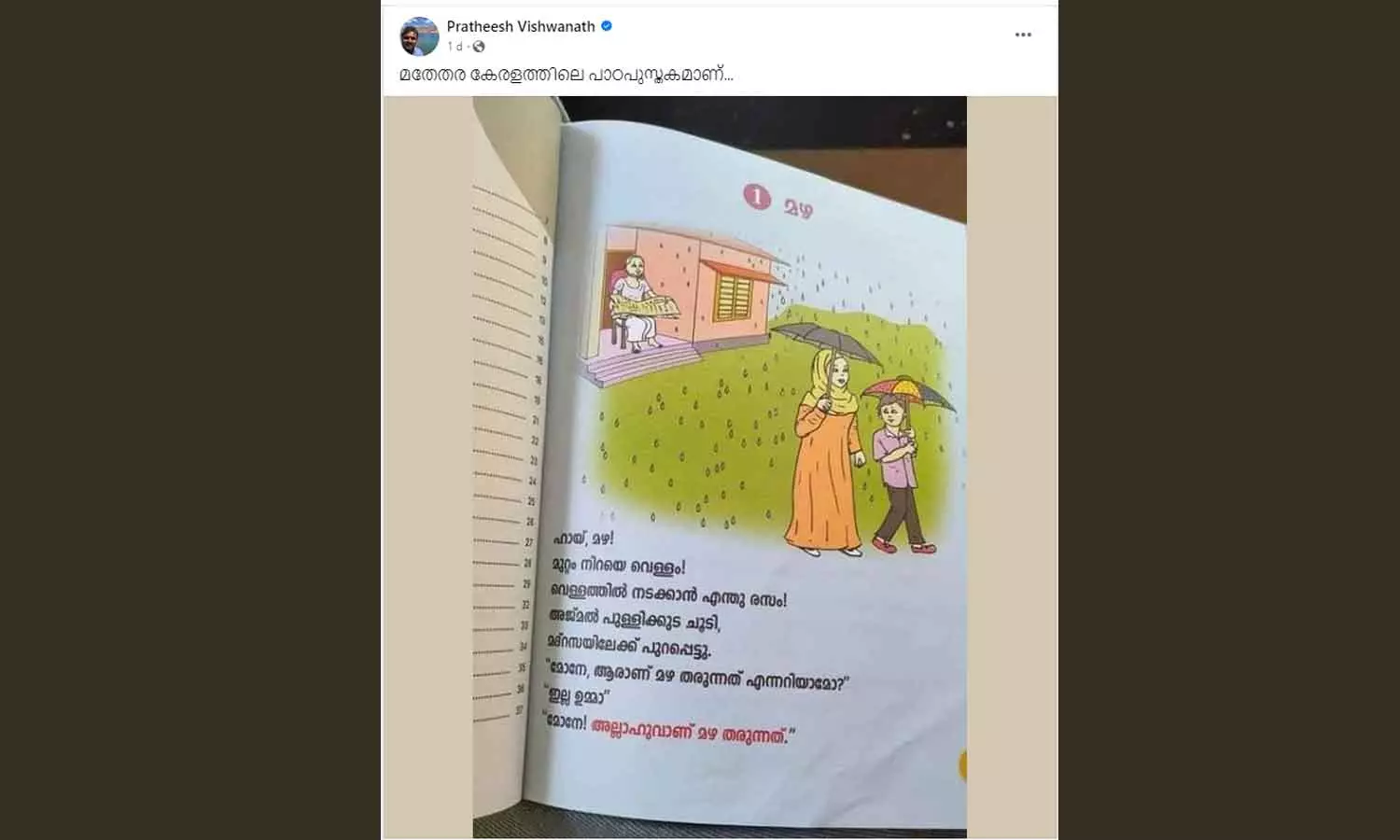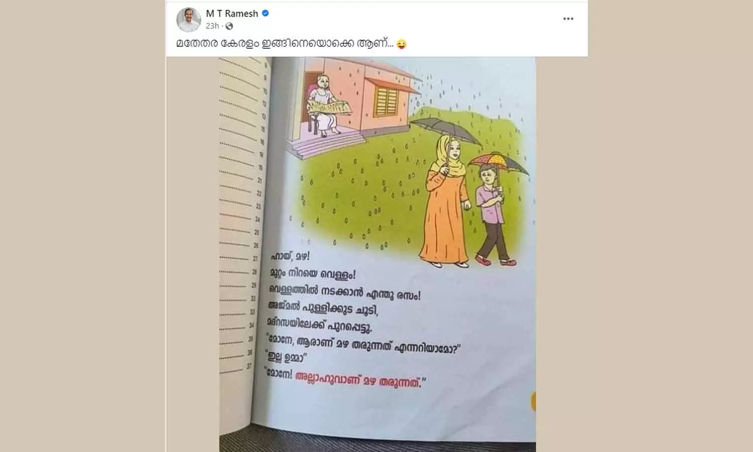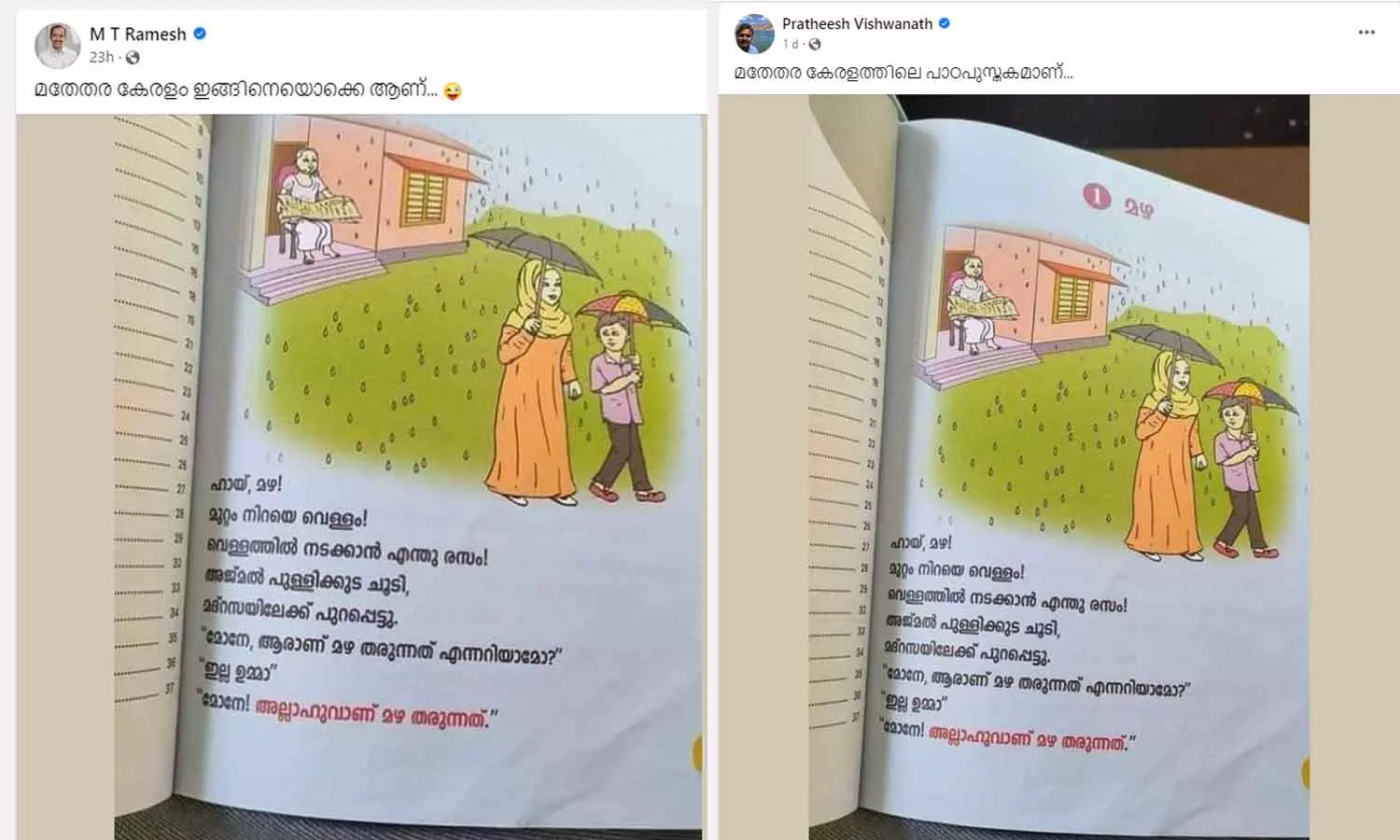 'മോനേ അല്ലാഹുവാണ് മഴ തരുന്നത്'; മദ്രസാ പാഠപുസ്തകത്തിൻറെ പേരിൽ സംഘ്പരിവാർ വിദ്വേഷപ്രചാരണം