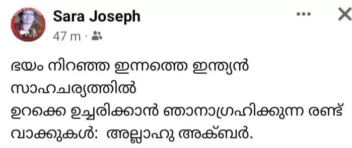 അല്ലാഹു അക്ബര്; ഭയം നിറഞ്ഞ ഇന്ത്യന് സാഹചര്യത്തില് ഉറക്കെ ഉച്ചരിക്കാന് ആഗ്രഹിക്കുന്ന രണ്ടു വാക്കുകള്: സാറാ ജോസഫ്
