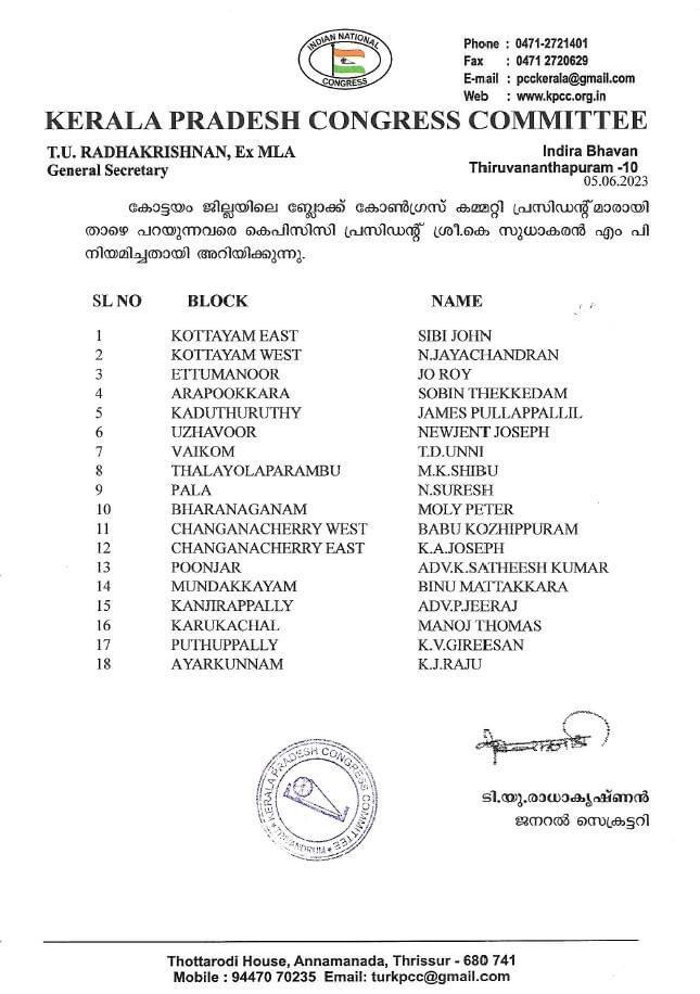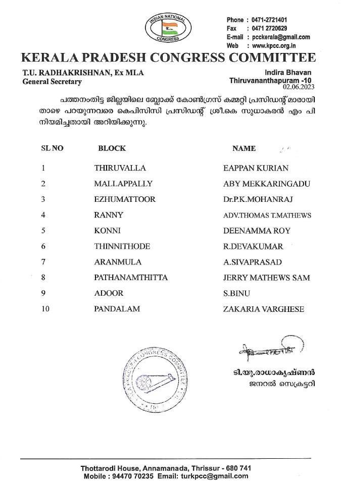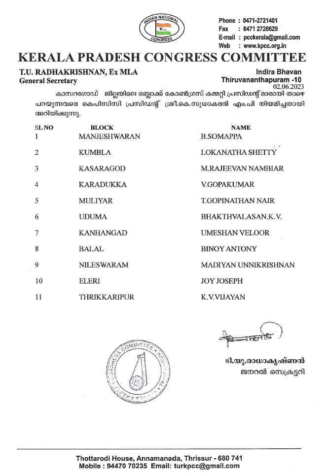 നീണ്ട ഇടവേളക്ക് ശേഷം താഴെതട്ടിൽ കോൺഗ്രസ് ഒരു പുനഃസംഘടന പൂർത്തിയാക്കി. 140 അസംബ്ലി മണ്ഡലങ്ങളിൽ 280 ബ്ലോക്ക് പ്രസിഡണ്ടുമാരെ നിശ്ചയിച്ചു. ജാതി,മത, ഗ്രൂപ്പ്, പ്രാദേശിക സമവാക്യങ്ങൾ പാലിച്ചാണ് തങ്ങൾ പുനഃസംഘടനകൾ നടത്തുന്നത് എന്ന് പരസ്യമായി സമ്മതിക്കാൻ മടിയില്ലാത്ത പാർട്ടിയാണ് കോൺഗ്രസ്. ഇത്തവണ ബ്ലോക്ക് പുനഃസംഘടിപ്പിച്ചപ്പോൾ കാസർകോട്, വയനാട്, ഇടുക്കി, കോട്ടയം, പത്തനംതിട്ട ജില്ലകളിൽ പേരിനു പോലും ഒരുമുസ്ലിമില്ല.