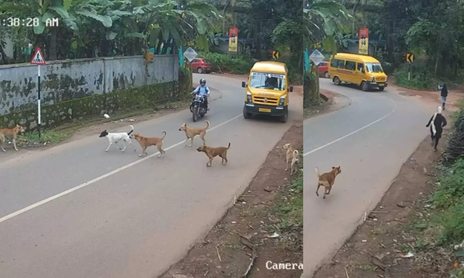 എതിര് ദിശയില് വന്ന വാഹനങ്ങള് ഹോണ് മുഴക്കിയതിനാല് നായകള് പിന്തിരിഞ്ഞു