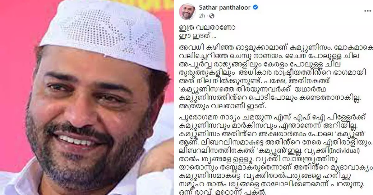 അവധി കഴിഞ്ഞ ഓട്ടമുക്കാലാണ് കമ്മ്യൂണിസമെന്ന് എസ്.കെ.എസ്.എസ്.എഫ് സംസ്ഥാന ജനറൽ സെക്രട്ടറി സത്താർ പന്തലൂർ. ലോകമാകെ വലിച്ചെറിഞ്ഞ ചെമ്പു നാണയമാണ് കമ്മ്യൂണിസമെന്നും സത്താർ ഫേസ്ബുക്ക് പോസ്റ്റിൽ കുറിച്ചു. കമ്പോളാധിപത്യത്തിന്റെ പുതിയ ലോകത്ത് എടുക്കാച്ചരക്കാണ് കമ്യൂണിസം.പുരോഗമന നാട്യം ചമയുന്ന എസ.എഫ്.ഐ പിള്ളേർക്ക് കമ്യൂണിസവും മാർകിസവും എന്താണെന്ന് അറിയില്ല. അജണ്ടകൾ നഷ്ടപ്പെട്ടവരുടെ അവസാനത്തെ അഭയമാണ് തെരുവുകൾ ചുവപ്പിച്ചു ചുവപ്പിച്ചു 'ചുവന്ന തെരുവുകൾ' ഉണ്ടാക്കാനുള്ള ശ്രമങ്ങൾ. മനുഷ്യത്വമുള്ളവർ അതിനെ ചെറുത്തു തോൽപ്പിച്ചേ പറ്റൂ എന്നും പറഞ്ഞാണ് ഫേസ്ബുക്ക് പോസ്റ്റ് അവസാനിക്കുന്നത്.