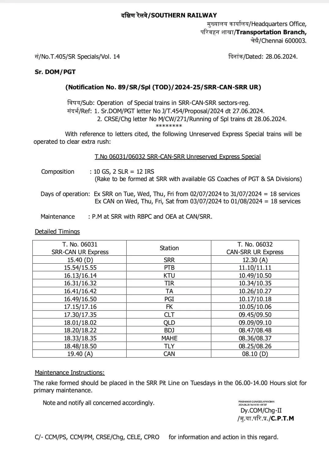 മലബാറിലെ യാത്രക്കാർക്ക് ആശ്വാസം; ഷൊർണൂർ-കണ്ണൂർ റൂട്ടിൽ സ്പെഷൽ ട്രെയിൻ