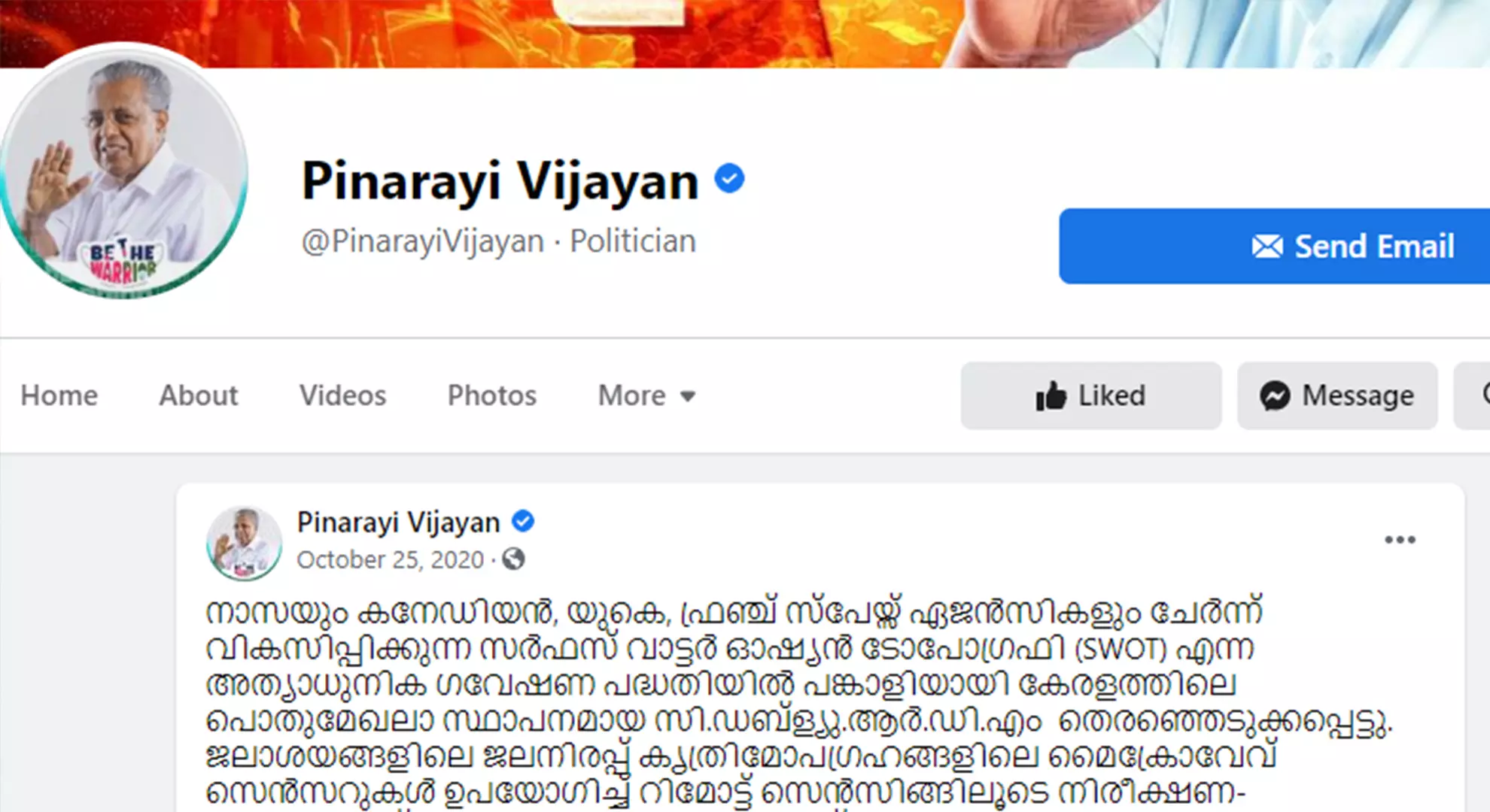 2020 ഒക്ടോബർ 25ന് മുഖ്യമന്ത്രി പങ്കുവെച്ച പോസ്റ്റിന്റെ പൂർണ രൂപം വായിക്കാം: