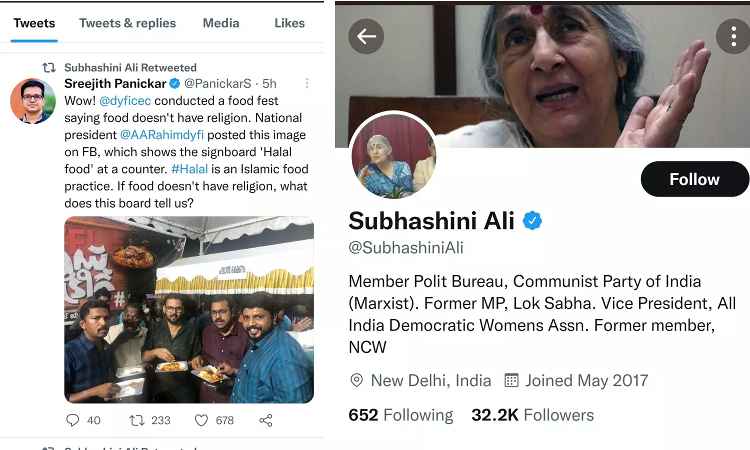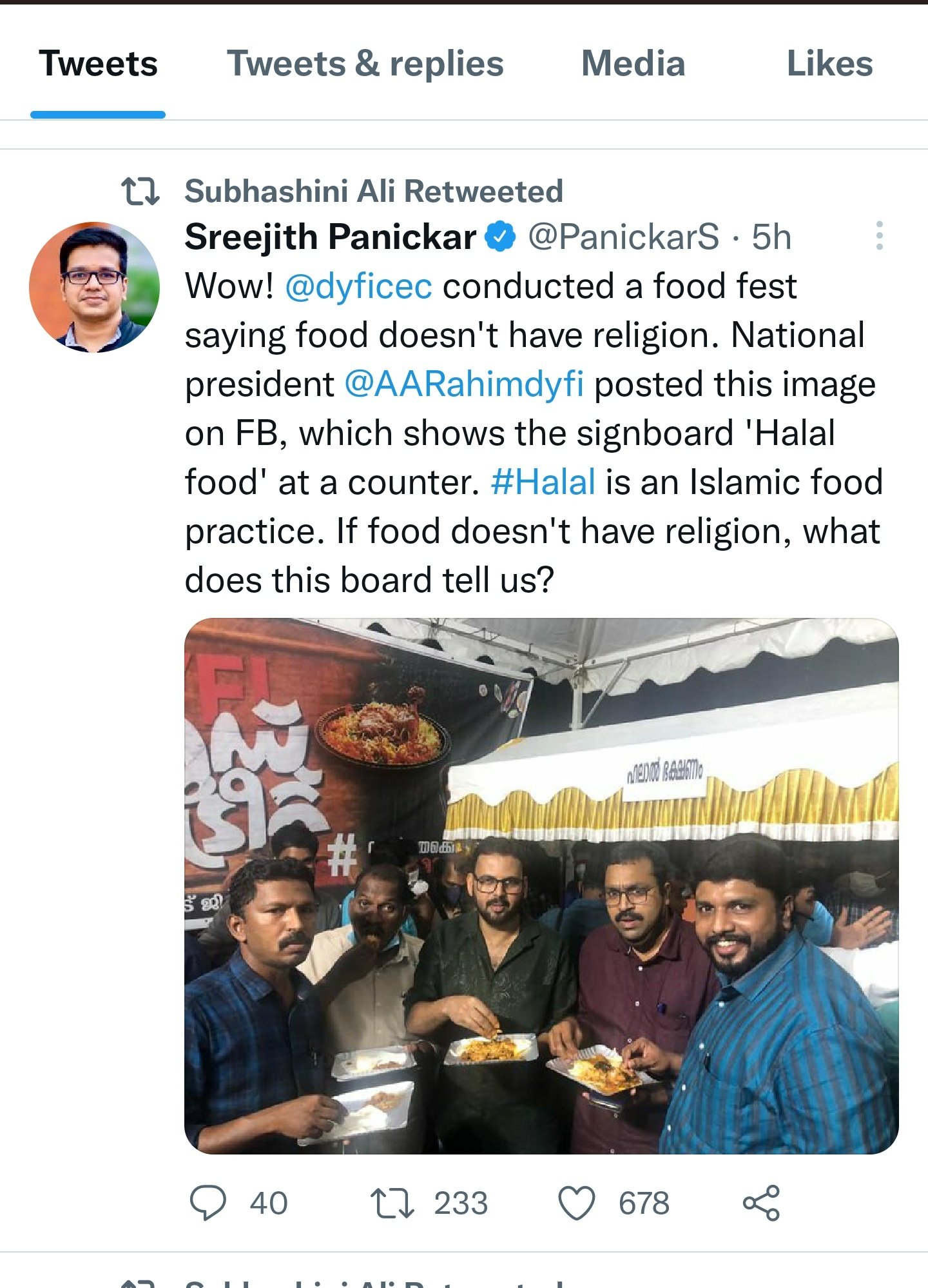 ഭക്ഷണത്തിന് മതമില്ലെന്ന് പറഞ്ഞുകൊണ്ടാണ് ഡിവൈഎഫ്ഐ ഫുഡ് ഫെസ്റ്റിവൽ സംഘടിപ്പിച്ചത്. എന്നാൽ അഖിലേന്ത്യാ പ്രസിഡന്റ് എഎ റഹീം ഫേസ്ബുക്കിൽ പോസ്റ്റ് ചെയ്ത ചിത്രത്തിലെ കൗണ്ടറിൽ 'ഹലാൽ ഫുഡ്' എന്ന ബോർഡ് കാണാം. ഹലാൽ എന്നത് ഒരു ഇസ്ലാമികമായ ഭക്ഷണ രീതിയാണ്. ഭക്ഷണത്തിന് മതമില്ലെങ്കിൽ പിന്നെന്താണ് ഈ ബോർഡ് കൊണ്ട് ഉദ്ദേശിക്കുന്നത്?-ശ്രീജിത്ത് പണിക്കരുടെ ഈ ട്വീറ്റ് ആണ് സുഭാഷിണി അലി റീട്വീറ്റ് ചെയ്തിരിക്കുന്നത്.