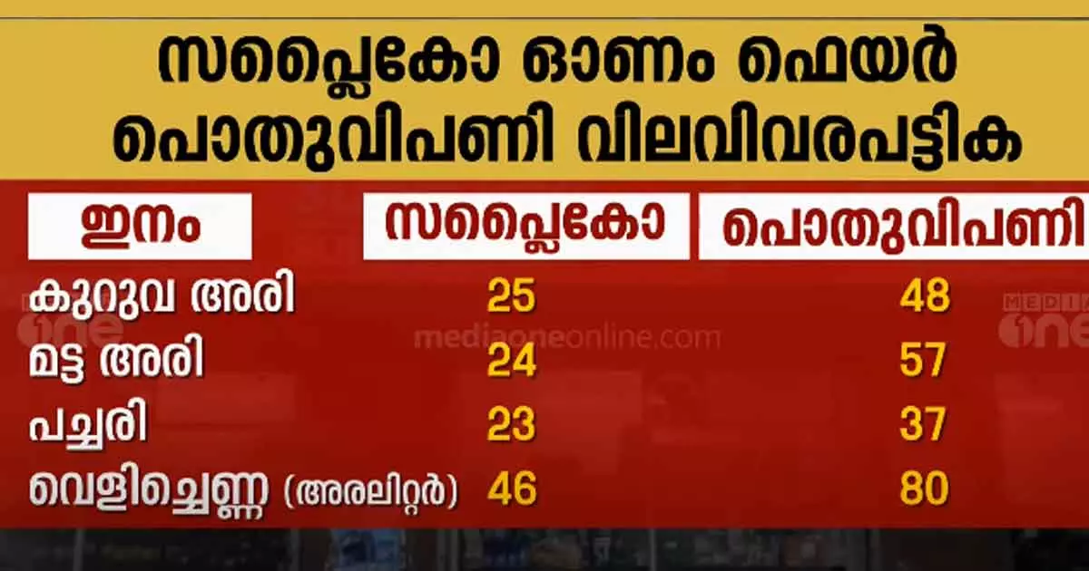 അരലിറ്റര് വെളിച്ചണ്ണ പൊതുവിപണിയില് നിന്ന് വാങ്ങാന് 80 രൂപ കൊടുക്കണം. ഓണം ഫെയറില് 46 രൂപയ്ക്ക് വാങ്ങാം. പഞ്ചസാരക്ക് 43 രൂപ നല്കേണ്ട സ്ഥാനത്ത് 22 രൂപ മതി സപ്ലൈകോയില്. അരക്കിലോ മുളകിന് 130 രൂപ പൊതുവിപണിയില് ഈടാക്കുമ്പോള് സപ്ലൈകോയില് 37.50 രൂപ മാത്രമാണ് വില. ജില്ലാ ഫെയറുകളില് സാധനങ്ങള് തീരുന്നതിനുസരിച്ച് എത്തിക്കുന്നതിനുള്ള സൌകര്യവും ഏര്പ്പാടാക്കിയിട്ടുണ്ട്. എല്ലാ സ്ഥലങ്ങളിലും മികച്ച പ്രതികരണമാണ് ആളുകളില് നിന്ന് ലഭിക്കുന്നതെന്ന് ജീവനക്കാര് പറയുന്നു. ഇരുപത്തിയെട്ടാം തിയ്യതി വരെ പ്രവര്ത്തിക്കുന്ന ഓണം ഫെയര് രണ്ട് ദിവസം പിന്നിടുമ്പോള് 10 ലക്ഷത്തിനടുത്ത് രൂപയുടെ വില്പ്പന നടന്നിട്ടുണ്ട്.