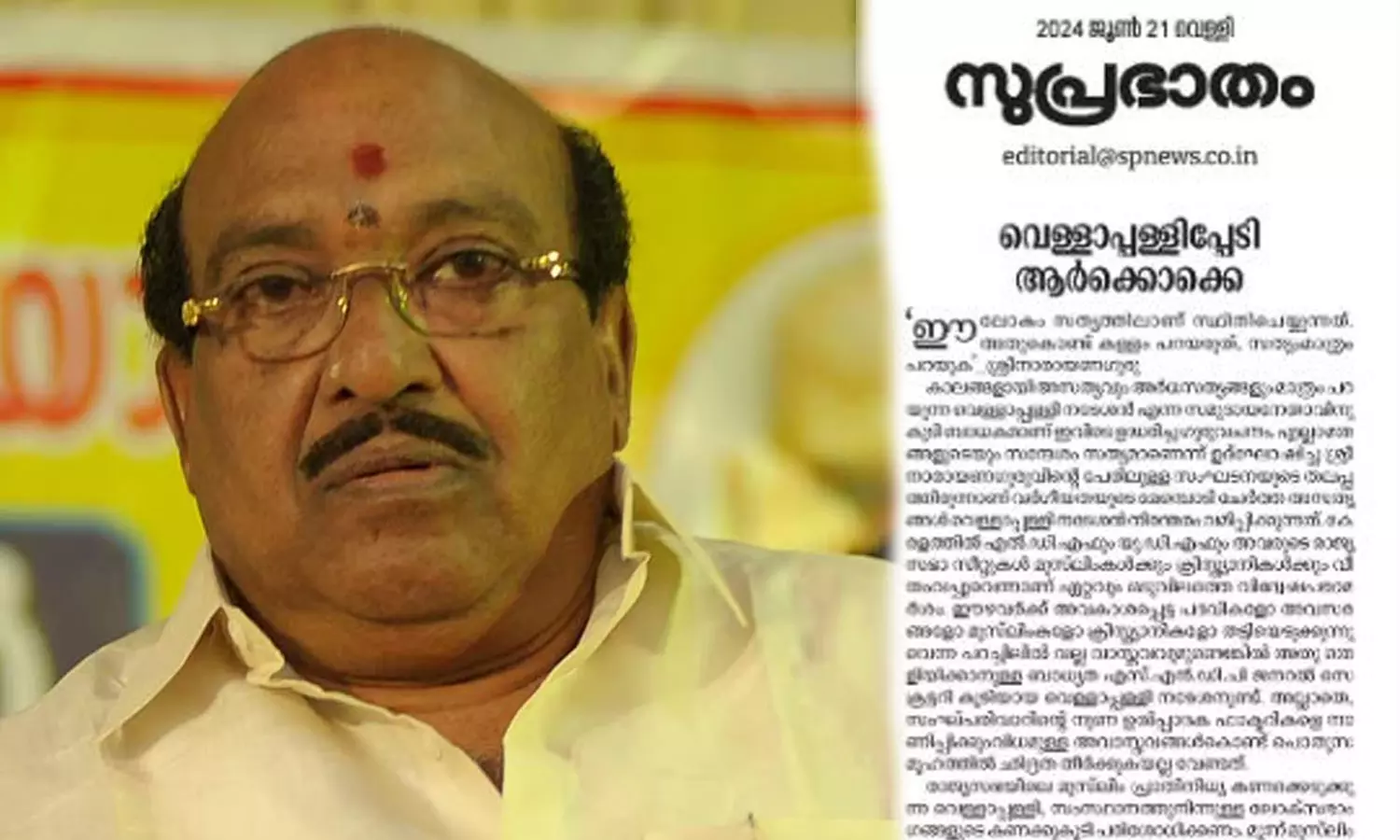 വസ്തുതകള് ജനങ്ങളെ ബോധ്യപ്പെടുത്താന് സംസ്ഥാന സര്ക്കാര് എന്തുകൊണ്ടാണ് മടിക്കുന്നതെന്നും സുപ്രഭാതം മുഖപ്രസംഗം ചോദിക്കുന്നു.വെള്ളാപ്പള്ളി നടേശനെതിരെ നടപടിയെടുക്കുന്നതിന് ആരാണ് സര്ക്കാരിനെ വിലക്കുന്നത് ? അപരമത വിദ്വേഷം പടര്ത്തുന്ന വെള്ളാപ്പള്ളി നവോത്ഥാന സമിതി ചെയര്മാന് ആയി തുടരുന്നത് എങ്ങനെ ? വെള്ളാപ്പള്ളിയുടെ വിഷം ചീറ്റലില് യു.ഡി.എഫ് പുലര്ത്തുന്ന മൗനം അപകടകരമെന്നും സമസ്ത മുഖപത്രം പറയുന്നു.