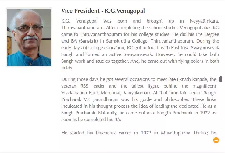എന്.ജി.ഒയുടെ വൈസ് പ്രസിഡന്റ് സ്ഥാനത്തിരിക്കുന്ന കെ.ജി വേണുഗോപാല് ആര്.എസ്.എസിന്റെ സജീവ പ്രവര്ത്തകനായിരുന്നുവെന്ന് ഔദ്യോഗിക വെബ്സൈറ്റ് തന്നെ സാക്ഷ്യപ്പെടുത്തുന്നു