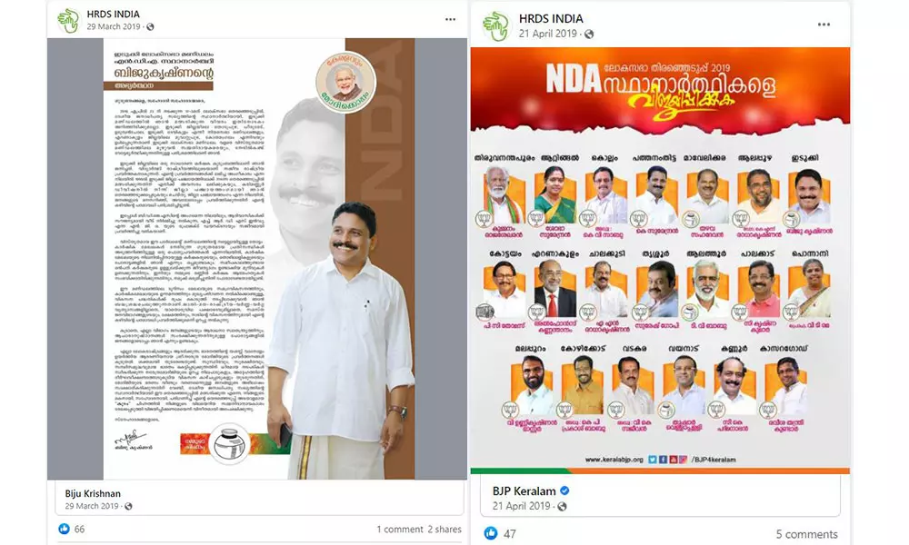 എച്ച്.ആര്.ഡി.എസിന്റെ സ്ഥാപകനും സെക്രട്ടറിയുമായ അജി കൃഷ്ണന്റെ സഹോദരനായിരുന്നു ഇടുക്കി ലോക്സഭാ മണ്ഡലം എന്.ഡി.എ സ്ഥാനാര്ഥിയായിരുന്ന ബിജു കൃഷ്ണന്. എച്ച്.ആര്.ഡി.എസിന്റെ പ്രോജക്ട് ഡയക്ടറാണ് ബിജു കൃഷ്ണന്. ബിജു കൃഷ്ണന്റെ തെരഞ്ഞെടുപ്പ് പ്രചാരണ പോസ്റ്ററും ബി.ജെ.പിയുടെ ഔദ്യോഗിക പേജിലെ പോസ്റ്ററും എച്ച്.ആര്.ഡി.എസ് അവരുടെ ഔദ്യോഗിക ഫേസ്ബുക്ക് പേജില് പങ്കുവെച്ചിട്ടുണ്ട്. ബി.ജെ.പിയുടെ മുന് സംസ്ഥാന അധ്യക്ഷനും ഗോവ ഗവര്ണറുമായ പി.എസ് ശ്രീധരന് പിള്ളയടക്കമുള്ളവര് എച്ച്.ആര്.ഡി.എസുമായി സജീവ സഹകരണത്തിലുള്ളവരാണ്.