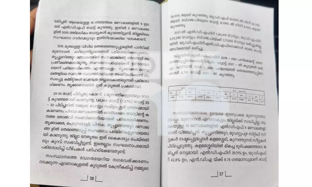 സംസ്ഥാനത്താകെയുള്ള ഇടതുമുന്നേറ്റത്തില് എറണാകുളം ജില്ലക്ക് മുന്നേറാന് സാധിച്ചില്ലെന്നും ആകെയുള്ള 14 മണ്ഡലങ്ങളില് അഞ്ച് മണ്ഡലങ്ങളിലാണ് എല്.ഡി.എഫിന് വിജയിക്കാനായതെന്നും റിപ്പോര്ട്ട് വ്യക്തമാക്കി