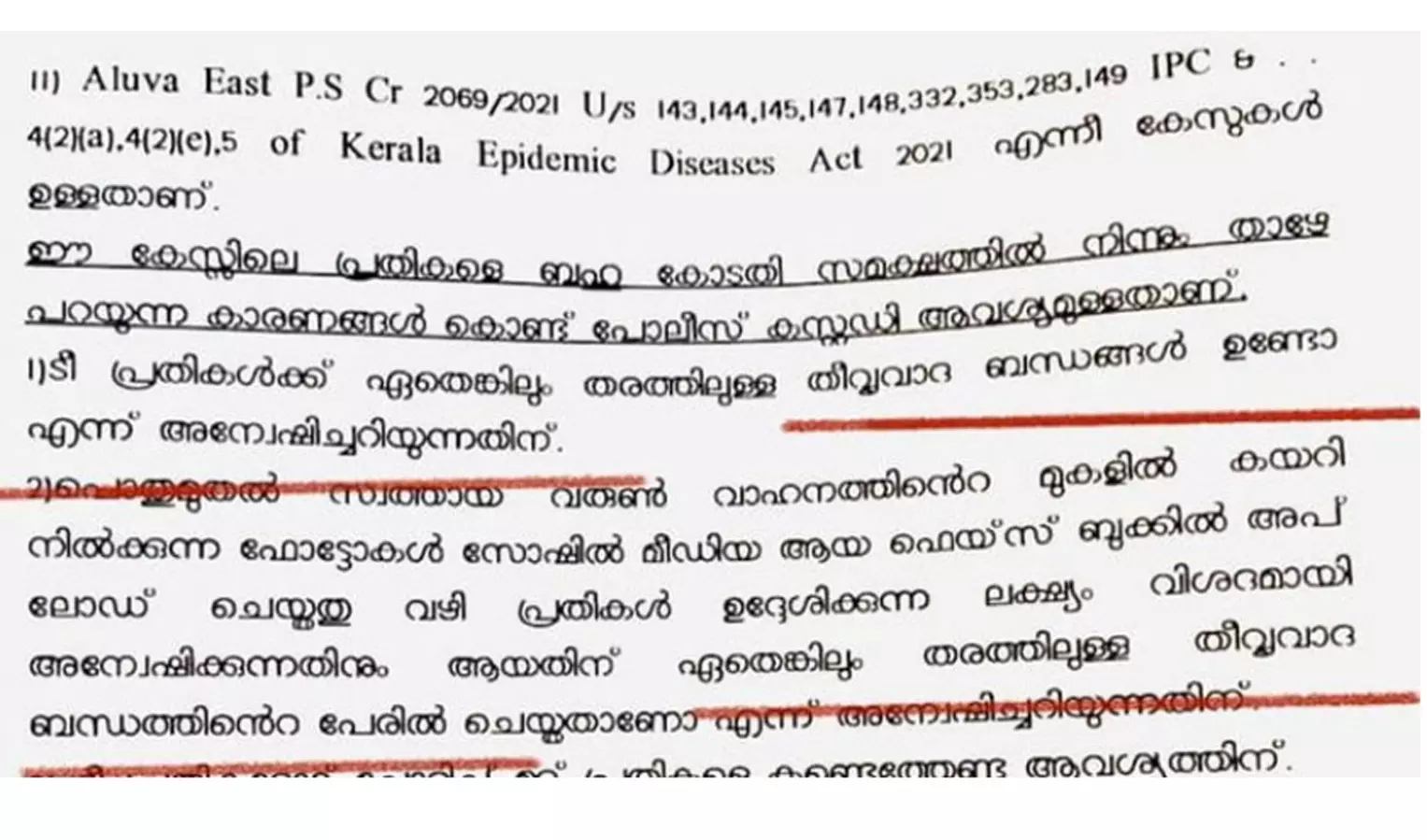 ആലുവ എസ്പി ഓഫീസിലേക്ക് നടന്ന മാർച്ചുമായി ബന്ധപ്പെട്ട് പൊലീസ് അറസ്റ്റ് ചെയ്ത കെഎസ്യു ആലുവ നിയോജക മണ്ഡലം പ്രസിഡന്റ് അൽ അമീൻ അഷ്റഫ്, യൂത്ത് കോൺഗ്രസ് മുൻ നിയോജക മണ്ഡലം ജനറൽ സെക്രട്ടറി എംഎകെ നജീബ്, യൂത്ത് കോൺഗ്രസ് മുൻ മണ്ഡലം വൈസ് പ്രസിഡന്റ് അനസ് പള്ളിക്കുഴി എന്നിവർക്കെതിരെയാണ് റിമാൻഡ് റിപ്പോർട്ടിൽ പൊലീസ് തീവ്രവാദി ആരോപണം നടത്തിയത്.