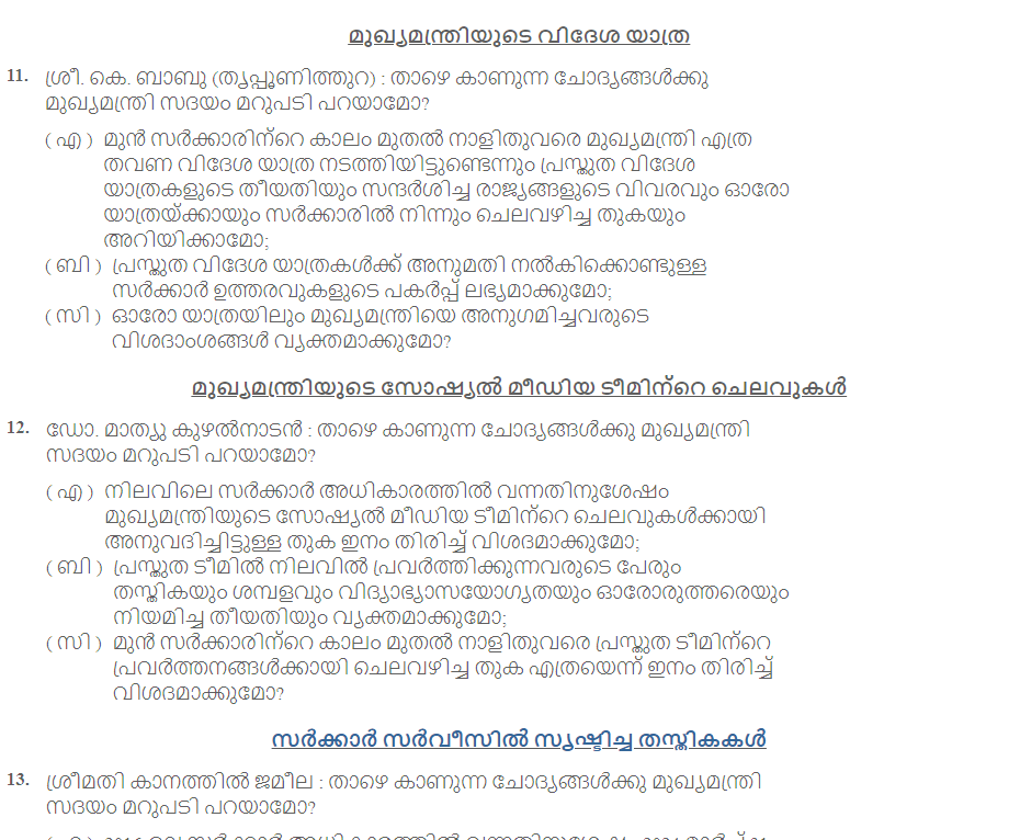 മുഖ്യമന്ത്രിയുടെ വിദേശയാത്രയുമായി ബന്ധപ്പെട്ട് തൃപ്പൂണിത്തുറ എം.എൽ.എ കെ.ബാബുവാണ് ചോദിച്ചിരിക്കുന്നത്. മുന് സർക്കാരിന്റെ കാലം മുതൽ നാളിതുവരെ മുഖ്യമന്ത്രി എത്ര തവണ വിദേശയാത്ര നടത്തിയിട്ടുണ്ട്. ആ യാത്രകളുടെ തീയതിയും സന്ദർശിച്ച രാജ്യങ്ങളുടെ വിവരവും, ഓരോ യാത്രയ്ക്കായും സർക്കാർ ചെലവഴിച്ച തുകയും സഭയെ അറിയിക്കാമോ എന്നായിരുന്നു ചോദ്യം. യാത്രകളിൽ മുഖ്യമന്ത്രിയെ അനുഗമിച്ചവരുടെ വിശദാംശങ്ങൾ വ്യക്തമാക്കണമെന്നും ആവശ്യപ്പെട്ടിരുന്നു.