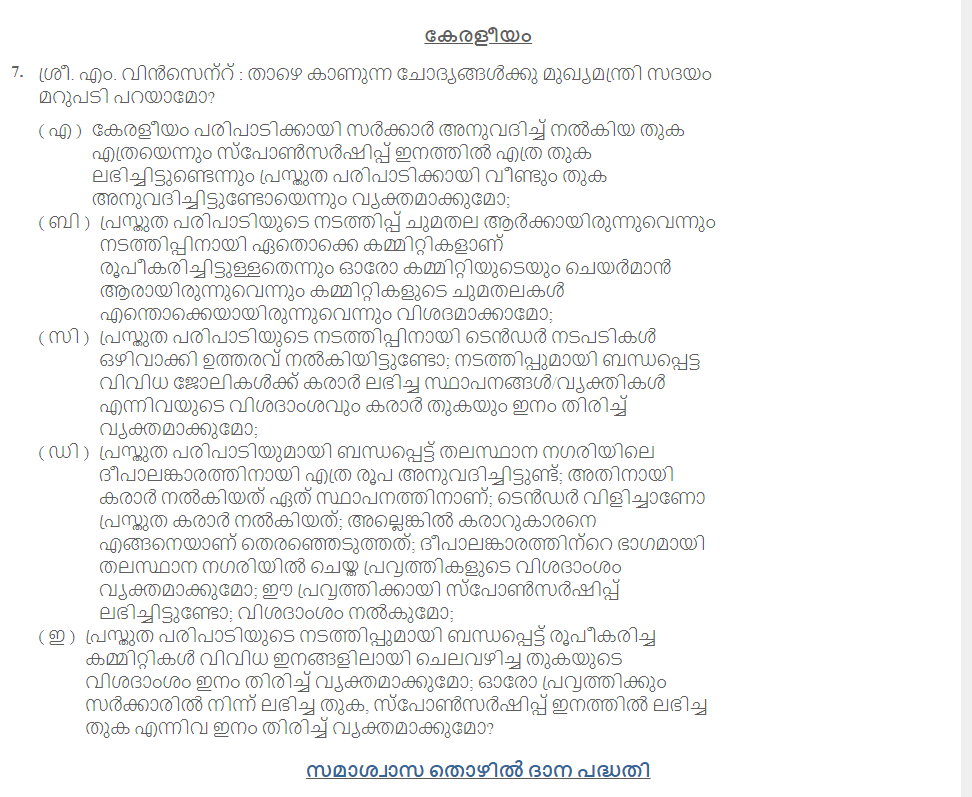 കേരളീയം പരിപാടിക്കായി സർക്കാർ അനുവദിച്ച് നൽകിയ തുക എത്ര? സ്പോൺസർഷിപ്പ് ഇനത്തിൽ എത്ര തുക ലഭിച്ചിട്ടുണ്ട്. പരിപാടിയുടെ നടത്തിപ്പിനായി ടെൻഡർ നടപടികൾ ഒഴിവാക്കി ഉത്തരവ് നൽകിയിട്ടുണ്ടോ. നടത്തിപ്പുമായി ബന്ധപ്പെട്ട വിവിധ ജോലികൾക്ക് കരാർ ലഭിച്ച സ്ഥാപനങ്ങൾ / വ്യക്തികൾ എന്നിവയുടെ വിശദാംശവും കരാർ തുകയും ഇനം തിരിച്ച് വ്യക്തമാക്കണമെന്നായിരുന്നു എം.വിൻസെന്റ് എം.എൽ.എയുടെ ചോദ്യം.