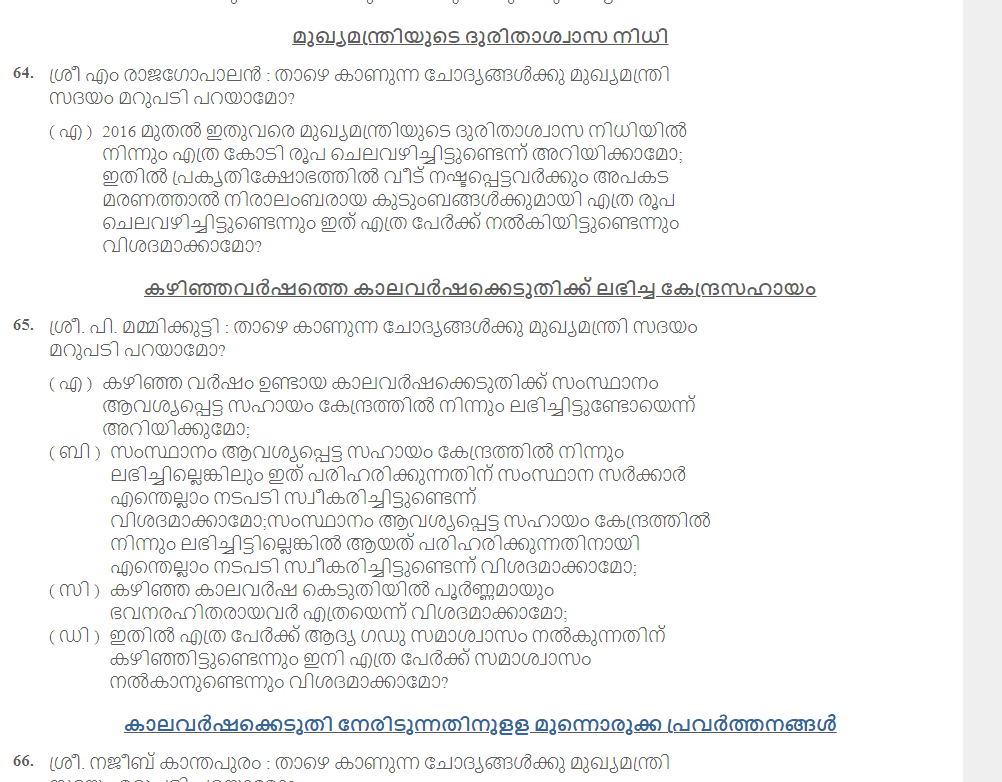 2016 മുതല് ഇതുവരെ മുഖ്യമന്ത്രിയുടെ ദുരിതാശ്വാസ നിധിയില് നിന്നും എത്ര കോടി രൂപ ചെലവഴിച്ചിട്ടുണ്ടെന്നായിരുന്നു എം.രാജഗോപാലൻ എം.എൽ.എയുടെ ചോദ്യം. പ്രകൃതിക്ഷോഭത്തില് വീട് നഷ്ടപ്പെട്ടവര്ക്കും അപകടമരണത്താല് നിരാലംബരായ കുടുംബങ്ങള്ക്കുമായി എത്രരൂപ ചെലവഴിച്ചിട്ടുണ്ടെന്നും വിശദമാക്കണമെന്നും ചോദ്യത്തിലുണ്ടായിരുന്നു.