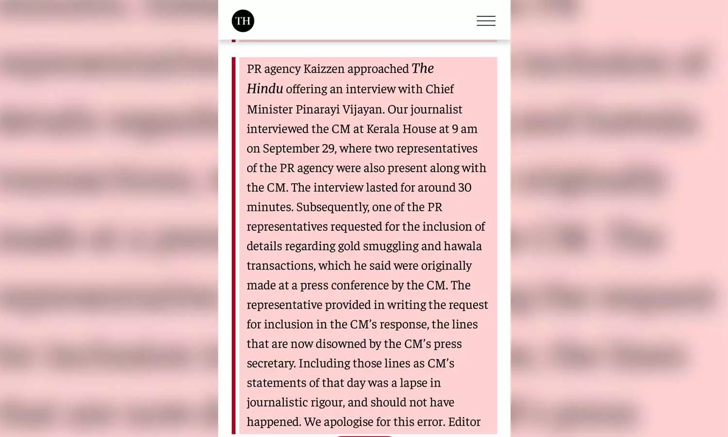 'കൈസെൻ എന്ന പിആർ ഏജൻസിയാണ് മുഖ്യമന്ത്രിയുടെ അഭിമുഖം നൽകാമെന്നു പറഞ്ഞ് ഞങ്ങളെ സമീപിച്ചത്. അഭ്യർഥന പ്രകാരം കേരള ഹൗസിൽ സെപ്തംബർ 29ന് രാവിലെ ഒമ്പതിനാണ് അദ്ദേഹവുമായി ഞങ്ങളുടെ ജേണലിസ്റ്റ് അഭിമുഖം നടത്തിയത്. ഇതിൽ പിആർ ഏജൻസിയുടെ രണ്ട് പ്രതിനിധികളും സന്നിഹിതരായിരുന്നു. അഭിമുഖം 30 മിനിറ്റ് നീണ്ടുനിന്നു. പിന്നീട്, സ്വർണക്കടത്ത്, ഹവാലാ ഇടപാടുകൾ തുടങ്ങിയവയുമായി ബന്ധപ്പെട്ട് മുഖ്യമന്ത്രി വാർത്താസമ്മേളനത്തിൽ നടത്തിയ പരാമർശങ്ങളും വിവരങ്ങളും കൂടി ഇതിൽ ഉൾപ്പെടുത്താനാവുമോ എന്ന് അവരിലൊരാൾ അഭ്യർഥിച്ചു. തുടർന്ന് ഇത് അവർ എഴുതി നൽകുകയും ചെയ്തു. എന്നാൽ ഇക്കാര്യങ്ങൾ ഇപ്പോൾ മുഖ്യമന്ത്രിയുടെ പ്രസ് സെക്രട്ടറി നിഷേധിച്ചിട്ടുണ്ട്. ആ പരാമർശങ്ങൾ മുഖ്യമന്ത്രിയുടെ അഭിമുഖത്തിലേതായി ഉൾപ്പെടുത്തിയതിൽ വീഴ്ചയുണ്ടായി. അതിൽ മാപ്പ് പറയുന്നു'- എന്നാണ് ദ ഹിന്ദുവിന്റെ വിശദീകരണം.