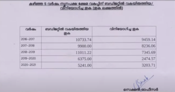 2016- 2017 വർഷം 107.34 കോടി രൂപയായിരുന്നു ബജറ്റ് വിഹിതം. 2020- 2021 ആകുമ്പോഴേക്കും അത് 52.41 കോടിയായി കുറഞ്ഞു. മുസ്ലിം, ക്രിസ്ത്യന്, പാഴ്സി, സിഖ്, ജൈന, വിഭാഗങ്ങൾക്കായാണ് ഈ തുക ചിലവഴിക്കേണ്ടത്. ഒരോ വിഭാഗത്തിനും എത്ര തുക ചിലവഴിച്ചുവെന്നതിന്റെ കണക്ക് സൂക്ഷിച്ചിട്ടില്ലെന്നും മുഖ്യമന്ത്രിയുടെ മറുപടിയിൽ വിശദീകരിക്കുന്നു.