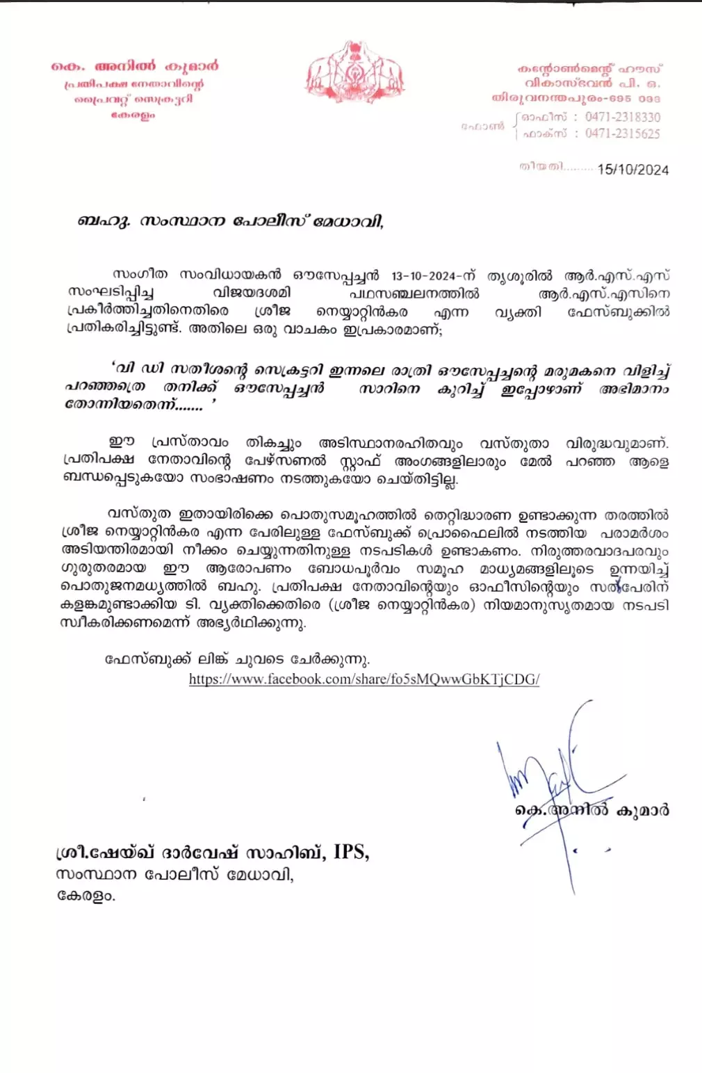 തിരുവനന്തപുരം: അപകീർത്തി പരാമർശത്തിൽ സംസ്ഥാന പൊലീസ് മേധാവിക്ക് പരാതി നൽകി പ്രതിപക്ഷ നേതാവിന്റെ പ്രൈവറ്റ് സെക്രട്ടറി. ശ്രീജ നെയ്യാറ്റിൻകര എന്ന ഫേസ്ബുക്ക് പ്രൊഫൈലിനെതിരെയാണ് പരാതി. സംഗീത സംവിധായകൻ ഔസേപ്പച്ചൻ ആര്എസ്എസ് പരിപാടിയിൽ പങ്കെടുത്തതിനെക്കുറിച്ചുള്ള ഫേസ്ബുക്ക് പോസ്റ്റിലാണ് കെ.അനിൽകുമാറിന്റെ പരാതി. അടിസ്ഥാന രഹിതവും വസ്തുതാവിരുദ്ധവുമായ പോസ്റ്റ് എന്ന് പരാതിയിൽ പറയുന്നു. പോസ്റ്റ് നീക്കം ചെയ്യണമെന്നും ശ്രീജയ്ക്കെതിരെ നടപടി വേണമെന്നും പരാതിയില് ആവശ്യപ്പെട്ടു.