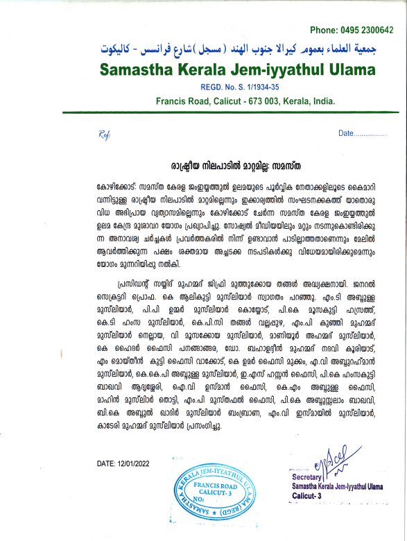പരമ്പരാഗത രാഷ്ട്രീയ നിലപാടിൽ മാറ്റമില്ലെന്ന് സമസ്ത