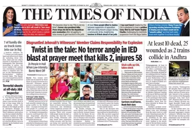 കോഴിക്കോട്: കളമശ്ശേരിയിൽ മൂന്നു പേർ കൊല്ലപ്പെട്ട സ്ഫോടനത്തിൽ 'ടെറർ ആംഗിൾ' ഇല്ലെന്ന് ടൈംസ് ഓഫ് ഇന്ത്യ. പശ്ചിമേഷ്യയിലെ സംഘർഷവുമായി ബന്ധപ്പെട്ട തീവ്രവാദി ആക്രമണമാണെന്നാണ് ആദ്യം കരുതിയിരുന്നത്. നിരവധി പ്രമുഖ വ്യക്തികൾ ഇതുമായി യോജിച്ചിരുന്നു. എന്നാൽ ഞായറാഴ്ച വൈകുന്നേരത്തോടെ യഹോവ സാക്ഷികളിൽപ്പെട്ട ഒരാൾ തന്നെയാണ് ഹീനമായ പ്രവൃത്തി ചെയ്തതെന്ന് പൊലീസ് സ്ഥിരീകരിച്ചെന്നും വാർത്തയിൽ പറയുന്നു. ടൈംസ് ഓഫ് ഇന്ത്യയുടെ കൊച്ചി എഡിഷനിൽ പ്രധാന തലക്കെട്ടായാണ് വാർത്ത പ്രസിദ്ധീകരിച്ചിരിക്കുന്നത്.