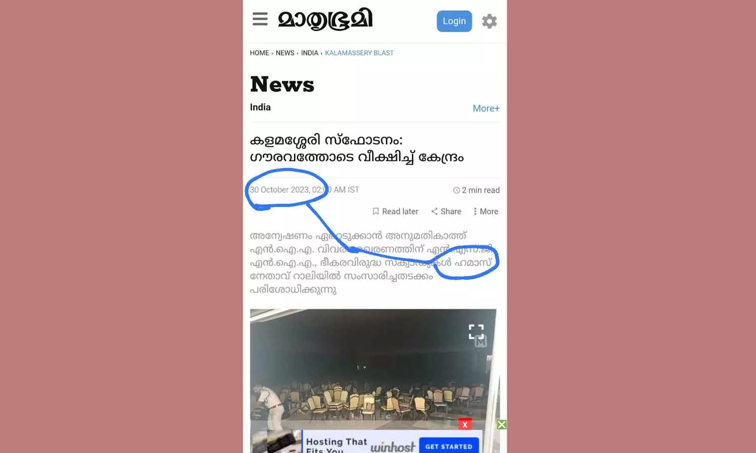 മൂന്നു പേർ കൊല്ലപ്പെട്ട സ്ഫോടനം; 'ടെറർ ആംഗിൾ' ഇല്ലെന്ന് ടൈംസ് ഓഫ് ഇന്ത്യ-ഹമാസ് ബന്ധം അന്വേഷിക്കുന്നുണ്ടെന്ന് മാതൃഭൂമി