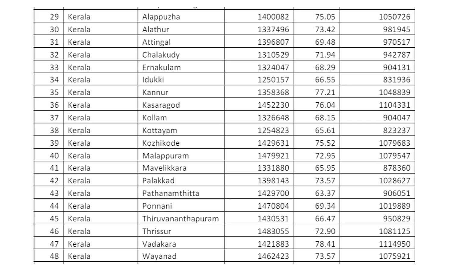 ഏറ്റവും കുറവ് വോട്ട് രേഖപ്പെടുത്തിയത് കോട്ടയത്താണ്. 12,548,23ൽ 8,23,237 പേരാണ് വോട്ട് ചെയ്തത്. 65.61 ആണ് വോട്ട് ശതമാനം.