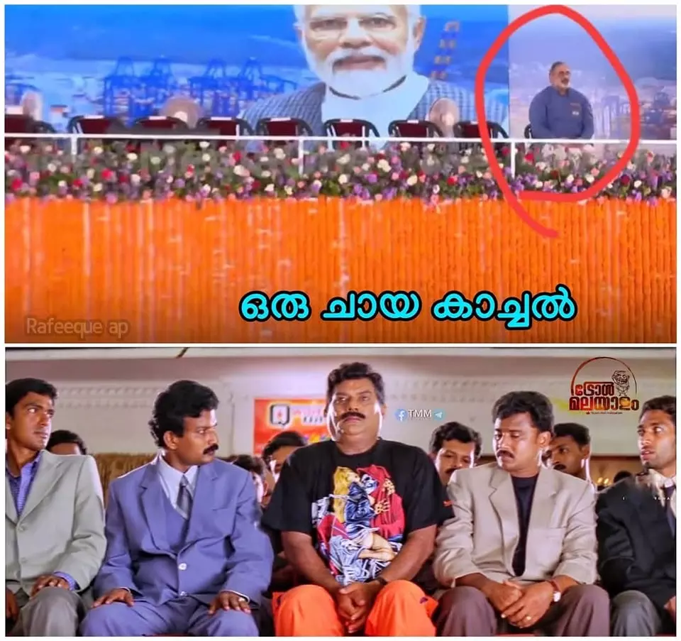 തിരുവനന്തപുരം: വിഴിഞ്ഞം തുറമുഖ ഉദ്ഘാടന വേദിയിൽ ബിജെപി സംസ്ഥാന അദ്ധ്യക്ഷൻ രാജീവ് ചന്ദ്രശേഖർ ഇരുന്നതാണ് ഇപ്പോൾ സമൂഹമാധ്യമങ്ങളിൽ ചിരിപടർത്തുന്നത്. പരിപാടി തുടങ്ങുന്നതിന്റെ മണിക്കൂറുകൾക്ക് മുമ്പെ വേദിയിലിരുന്ന നടപടിയാണ് ട്രോന്മാരെ 'ഉണർത്തിയത്'.