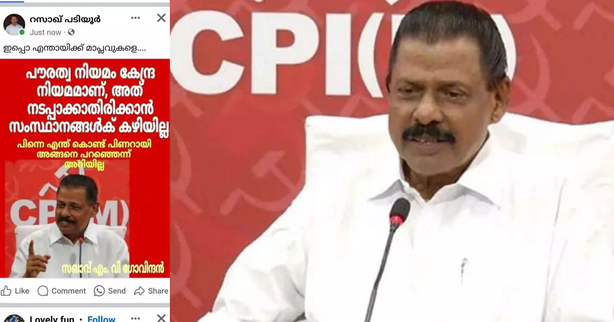 തിരുവനന്തപുരം: സിപിഎം സംസ്ഥാന സെക്രട്ടറി എം.വി ഗോവിന്ദനെതിരെ സമൂഹ്യമാധ്യമങ്ങൾ വഴി വ്യാജപ്രചാരണം നടത്തുന്നുവെന്ന് കാണിച്ച് പാർട്ടിയുടെ കണ്ണൂർ ജില്ലാ സെക്രട്ടറിയുടെ ചുമതലയുള്ള ടി.വി രാജേഷ് ഡി.ജി.പിക്കും മുഖ്യതെരഞ്ഞെടുപ്പ് ഓഫീസർക്കും പരാതി നൽകി. ലോക്സഭ തെരഞ്ഞെടുപ്പ് പ്രചരണത്തിനിടെ വോട്ടർമാരിൽ ഭിന്നിപ്പുണ്ടാക്കി ജനങ്ങൾക്കിടയിൽ ലഹള സൃഷ്ടിക്കാനുള്ള ഉദ്ദേശത്തിലാണ് വ്യാജപ്രചാരണമെന്ന് പരാതിയിൽ പറഞ്ഞു. റസാഖ് പടിയൂർ എന്ന ഫേസ്ബുക്ക് പേജിലൂടെയാണ് എം.വി ഗോവിന്ദന്റെ ചിത്രവും പാർട്ടി ചിഹ്നവും ചേർത്ത് വ്യാജ പ്രസ്താവന പ്രചരിപ്പിച്ചതെന്നും ചൂണ്ടിക്കാട്ടി. 'ഇപ്പോ എന്തായ്ക്ക് മാപ്ലാവുകളെ' എന്ന മേൽകുറിപ്പോടെയാണ് ചിത്രം പ്രചരിപ്പിക്കുന്നതെന്നും പറഞ്ഞു.