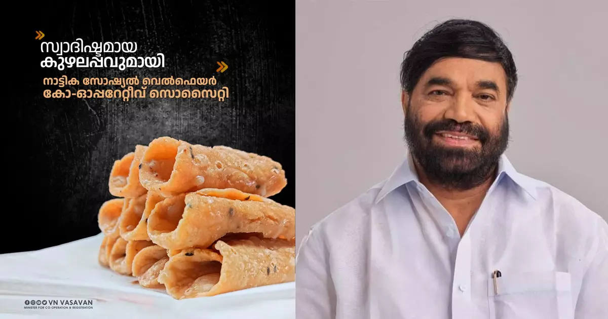 |മായം ചേര്ക്കാത്ത, സ്വാദിഷ്ടമായ, കുതിര്ന്ന് ഗുണനിലവാരം നഷ്ടമാകാത്ത കുഴലപ്പവും മുറുക്കുകളും വിവിധ തരം മിക്സചറുകളും സഹകരണ സംഘത്തിന്റെ പ്രത്യേകതയാണെന്നും വാസവന് ഫേസ്ബുക്കില് കുറിച്ചു.