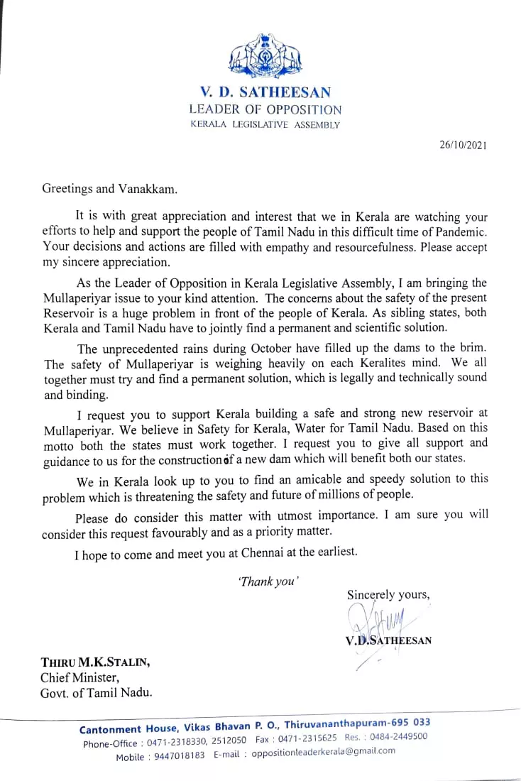 മുല്ലപ്പെരിയാറിൽ പുതിയ ഡാം നിർമിക്കണമെന്നാവശ്യപ്പെട്ട് തമിഴ്നാട് മുഖ്യമന്ത്രി എം.കെ. സ്റ്റാലിന് പ്രതിപക്ഷ നേതാവ് വി.ഡി. സതീശൻ കത്തയച്ചു. തമിഴ്നാടിന് ജലം, കേരളത്തിന് സുരക്ഷ എന്നതാണ് അനുയോജ്യമായ നിലപാടെന്നും പ്രതിപക്ഷ നേതാവിന്റെ കത്തിലുണ്ട്. ജലനിരപ്പ് 136 അടിയിലെത്തിയതോടെ കേരളത്തിലെ ജനങ്ങളുടെ ആശങ്ക വർധിച്ചെന്നും 125 വർഷത്തിലധികം പഴക്കമുള്ള ഡാമിന്റെ സുരക്ഷയിലും സംശയുമുണ്ടെന്നും കത്തിൽ പറയുന്നു. മുല്ലപ്പെരിയാറിൽ പുതിയ ഡാം നിർമിക്കാൻ തമിഴ്നാട് സർക്കാരിന്റെ പൂർണ പിന്തുണ അദ്ദേഹം ആവശ്യപ്പെട്ടു. പ്രശ്നം അടിയന്തര പ്രാധാന്യത്തോടെ പരിഗണിക്കണമെന്നും അദ്ദേഹം ആവശ്യപ്പെട്ടു. ചെന്നൈയിൽ വച്ച് സ്റ്റാലിനുമായി കൂടിക്കാഴ്ച നടത്തുമെന്നും അദ്ദേഹം കത്തിൽ അറിയിച്ചു.